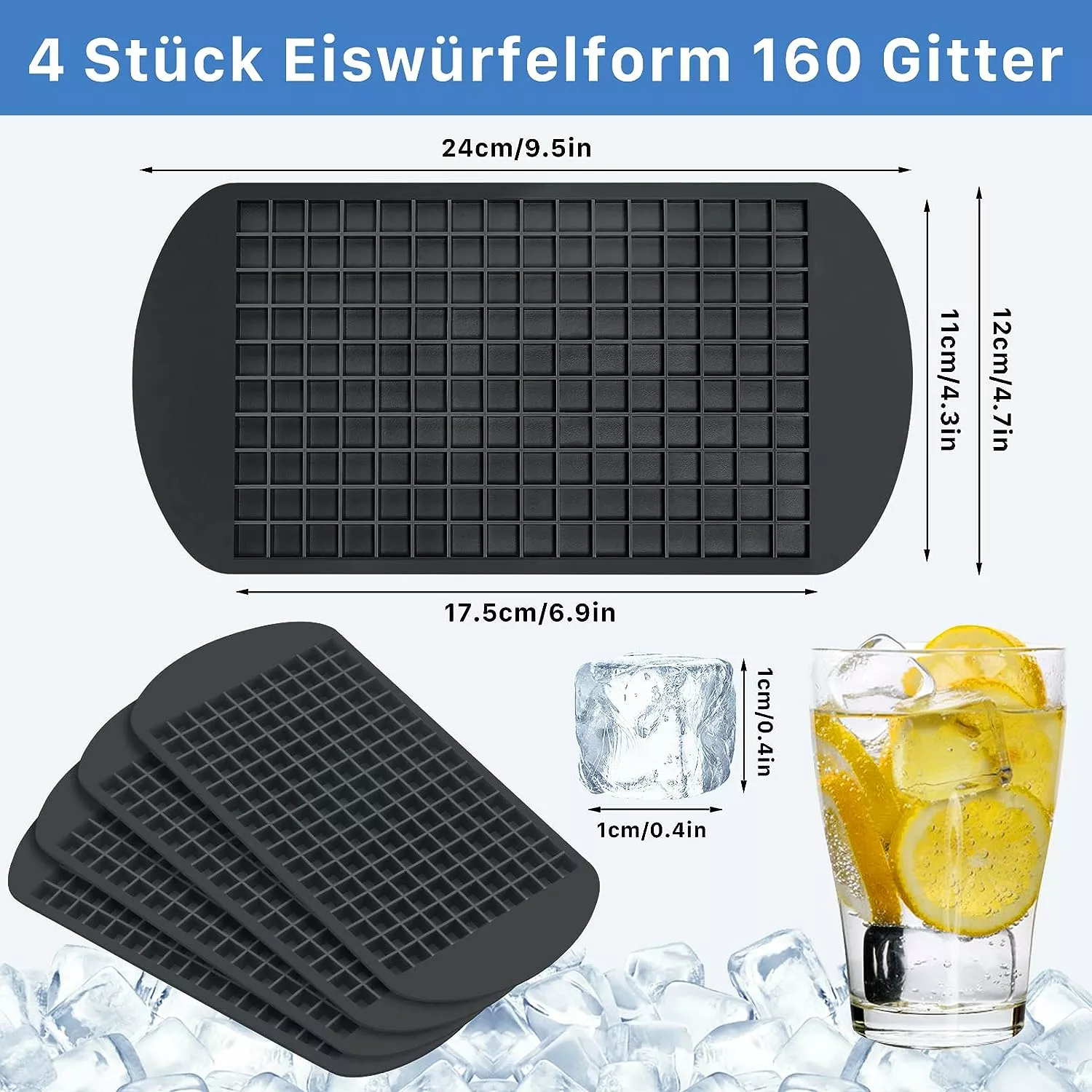 Ministorlek & 160 isgaller: 4 stycken svarta miniiskubbrickor i storleken 24 x 12 cm. Varje bricka har 160 isgaller och storleken på varje isgaller är 1 x 1 x 1 cm. Den kan göra 160 bitar isbitar åt gången.