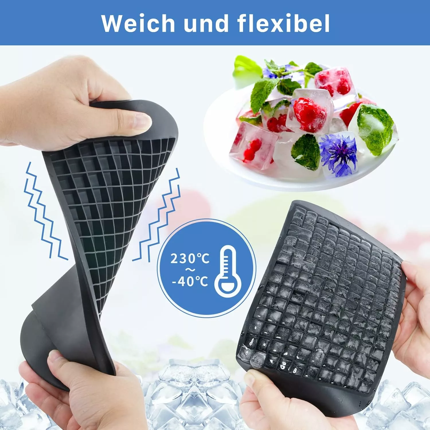 Lätt att använda och frigöra: Ta ut isbrickan ur kylskåpet och håll sedan försiktigt i botten av silikonisbrickan. Flexibelt silikon, gör att isbitarna kan tas ur form mycket enkelt, perfekt för alla drycker.