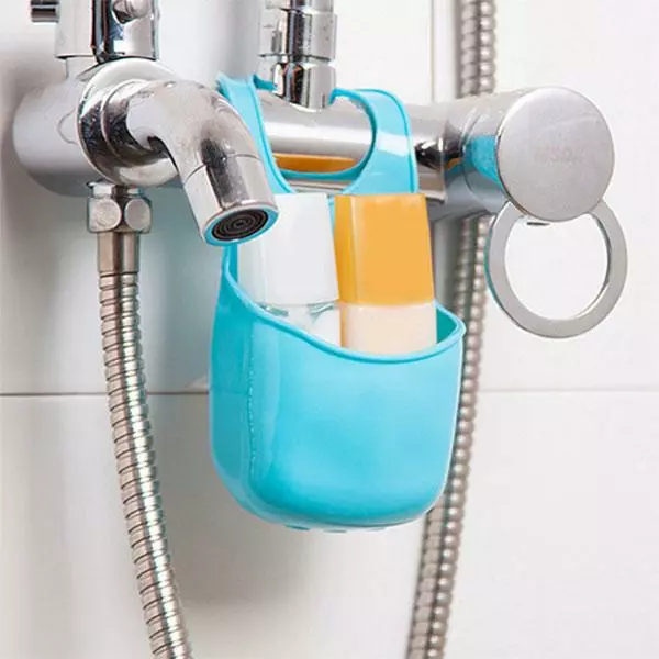 I duschen kan man ibland behöva extra förvaring för t ex tvättsvamp, tvål eller liknande och även i köket kan man använda den för att förvara diskborste, trasa eller annat sådant. Häng den bara runt en kran eller liknande. Du kan knäppa upp fästet ifall du behöver, om det t ex inte skulle gå att bara trä på den.