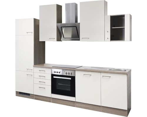 Denna 280 cm breda köksinredning består av (bxhxd): 1 inbyggnadsskåp för vitvaror 60 x 200 x 57 cm – 1 nisch 88 cm hög – 3 dörrar – 1 hyllplan 1 lådskåp 50 x 82 x 57 cm – 3 utdragbara lådor – 1 låda1 inbyggnadsskåp för spis 60 x 82 x 57 cm – 1 nisch för inbyggnadsspis – 1 fast front1 front med sockel för helintegrerad diskmaskin1 diskbänkskåp 50 x 82 x 57 cm – 1 dörr1 överskåp 50 x 89 x 32 cm – 2 hyllplan – 1 dörr1 överskåp 60 x 89 x 32 cm – 2 hyllplan – 1 dörr 1 överskåp glas 50 x 55 x 32 cm – 1 hyllplan – 1 dörr1 bänkskiva 220 x 60 cm