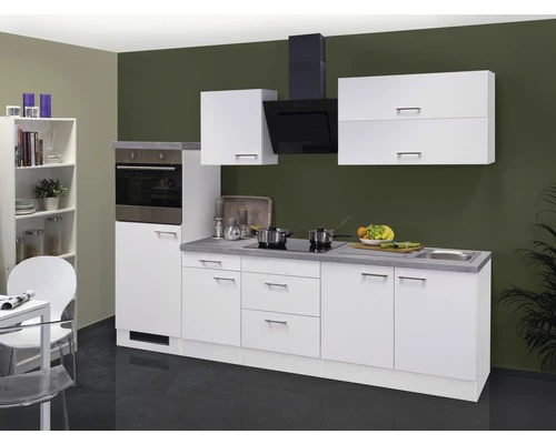 Är du på jakt efter ett nytt kök? Du vill inte ha en färdig produkt utan tycker att det är roligt att ta saken i egna händer? De förkonfigurerade köksinredningarna imponerar med sin design och de många olika funktionerna. Skåpsdörrarna kan hängas på vänster eller höger sida vilket gör det mycket flexibelt för dig vid monteringen. De lättskötta plastfronterna av hög kvalitet och de stabilt konstruerade skåpsstommarna garanterar att du kan ha glädje av köket länge. En bänkskiva i passande design ingår naturligtvis alltid i våra kök. Här är det lätt att hålla ordning Det 55 cm höga väggskåpet med ett hyllplan och de båda trendiga överskåpen med klaffluckor med en höjd på vardera 32 cm ger gott om plats för porslin och glas. I det 50 cm breda bänkskåpet med lådor och dörr, och i det 60 cm breda skåpet för spishäll med två lådor, finns det plats för bestick, kastruller och/eller livsmedel. I diskbänkskåpet finns det också gott om plats för förvaring av köks- eller städredskap. Skulle du någon gång behöva mer plats kan du enkelt utöka köket med ytterligare skåp ur NEO-serien. Extra snygg och praktisk är det nya demi-inbyggnadsskåpet med högt placerad ugnsnisch och 88 cm hög kylskåpsnisch därunder. Vitvaror inklusive I det rymliga kylskåpet, som har en nettovolym på 104 liter, finns det gott om plats för livsmedel, som kan fördelas mellan tre fack och en frukt- och grönsakslåda. Frysfacket med 4 stjärnor rymmer 17 liter och är bra för långvarig lagring av känsliga livsmedel men även för infrysning. På den eleganta glaskeramikhällen med 4 zoner går det snabbt att laga goda måltider. Och den moderna och kraftfulla köksfläkten utan kåpa ser till att matos snabbt bryts ner (för återcirkulation och frånluft).