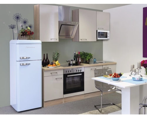 Har du redan ett kylskåp som du inte vill skilja dig från? Då är detta i övrigt fullt utrustade pentryköket det helt rätta! Produktegenskaper för pentryköket Nepal 220, inklusive vitvaror Fronten som glänser i varm kashmirbeige i kombination med stommens och bänkskivans sonoma-ekdekor skapar ett elegant inslag i rummet. De moderna och enkla metallhandtagen framhäver denna egenskap. På välsorterade 220 cm hittar du allt du behöver för matlagning, diskning och förvaring. På en energisnål inbyggd spis med front i rostfritt stål, ugn och spishäll kan du laga härliga rätter till hela familjen. En annan designaspekt är den kraftfulla fläkten i rostfritt stål. Den speciella formen gör att du kan röra dig fritt när du lagar mat. En extra höjdpunkt är 700 W mikrovågsugn med 6 effektnivåer och en praktisk upptiningsfunktion. Två extra stora väggskåp, 50 och 60 cm breda, vardera med två hyllplan och ett 50 cm väggskåp med hyllplan, ger gott om plats för glas och porslin. Den helintegrerade diskmaskinen imponerar gällande viktiga funktioner. Ett 50 cm brett bänkskåp med lådor och hyllor samt det 50 cm breda diskbänksbänkskåpet med diskho i rostfritt stål och avrinningsho ger också värdefullt förvaringsutrymme. För att underlätta planeringen är skåpdörrarna förberedda för montering både på vänster och höger sida. En annan inte obetydlig fördel: Detta pentrykök växer med dina behov och byggas ut med andra skåp i Nepal-serien til en låg kostnad. Vad mer bör du veta om ditt nya pentrykök Det i Tyskland tillverkade pentryköket Nepal 220 levereras omonterat i delar. De lättbegripliga monteringsanvisningarna möjliggör snabb montering. Utskärningar för diskbänken och kokhällen måste beaktas vid monteringen – på så sätt kan du fortfarande vara flexibel vid placeringen av skåpen. Med pentryköket Nepal 220 har du redan planerat ditt kök – med snabb tillgänglighet och till ett permanent lågt pris! Vad väntar du på? Slå till och skaffa pentryköket Nepal 220 inklusive vitvaror.