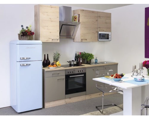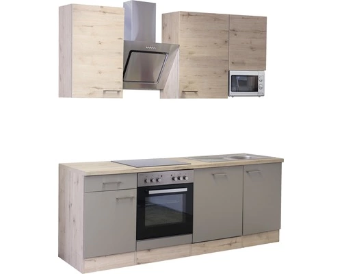Den 220cm breda köksinredningen består av : bänkskåp 50cm – 1 låda – 1 dörr – 1 hyllplan, Inbyggnadsskåp för spis 60cm – 1 fast front – 1 nisch för standardinbyggnadsspis, Frontpanel för helintegrerad diskmaskin, Sockel för diskmaskin, Bänkskåp för diskbänk 50cm – 1 dörr, Överskåp 50cm – 2 hyllplan – 1 dörr – höjd 89cm, Överskåp 60 cm – 2 hyllplan – 1 dörr – höjd 89 cm, Överskåp 50cm – 1 hyllplan – 1 dörr – höjd 55cm, Bänkskiva 220×60 cm