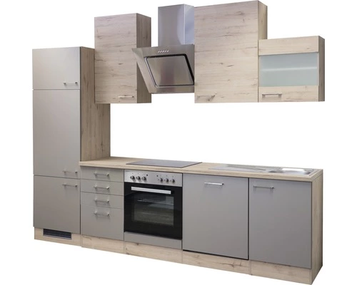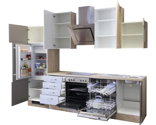 Denna 280 cm breda köksinredning består av (bxhxd): 1 inbyggnadsskåp för vitvaror 60 x 200 x 57 cm – 1 nisch 88 cm hög – 3 dörrar – 1 hyllplan 1 lådskåp 50 x 82 x 57 cm – 3 utdragbara lådor – 1 låda1 inbyggnadsskåp för spis 60 x 82 x 57 cm – 1 nisch för inbyggnadsspis – 1 fast front1 front med sockel för helintegrerad diskmaskin1 diskbänkskåp 50 x 82 x 57 cm – 1 dörr1 överskåp 50 x 89 x 32 cm – 2 hyllplan – 1 dörr1 överskåp 60 x 89 x 32 cm – 2 hyllplan – 1 dörr 1 överskåp glas 50 x 55 x 32 cm – 1 hyllplan – 1 dörr1 bänkskiva 220 x 60 cm