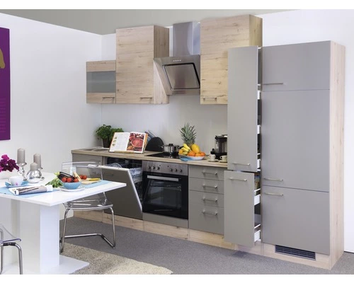 Det 310 cm breda pentryt består av (BxHxD): inbyggnadsskåp 60x200x60cm – 1 nisch 88cm hög – 3 dörrar – 1 hyllplan, Skåp 30x200x60cm – 2 utdrag – 5 hyllor, Lådskåp 50x82x57cm – 3 lådor – 1 utdrag, Inbyggnadsskåp för spis 60x82x57cm – 1 nisch för inbyggnadsspis – 1 fast front, Frontpanel med sockel för helintegrerad diskmaskin, Diskbänksskåp 50x82x57cm – 1 dörr, Överskåp 50x89x32cm – 2 hyllplan – 1 dörr, Överskåp 60x89x32cm – 2 hyllplan – 1 dörr, Glasöverskåp 50x55x32cm – 1 hyllplan – 1 dörr, Bänkskiva 220x60cm