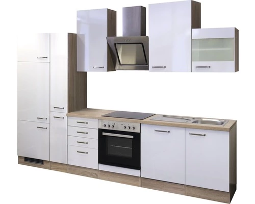 Det 310 cm breda pentryt består av (BxHxD): inbyggnadsskåp 60x200x60cm – 1 nisch 88cm hög – 3 dörrar – 1 hyllplan, Skåp 30x200x60cm – 2 utdrag – 5 hyllor, Lådskåp 50x82x57cm – 3 lådor – 1 utdrag, Inbyggnadsskåp för spis 60x82x57cm – 1 nisch för inbyggnadsspis – 1 fast front, Frontpanel med sockel för helintegrerad diskmaskin, Diskbänksskåp 50x82x57cm – 1 dörr, Överskåp 50x89x32cm – 2 hyllplan – 1 dörr, Överskåp 60x89x32cm – 2 hyllplan – 1 dörr, Glasöverskåp 50x55x32cm – 1 hyllplan – 1 dörr, Bänkskiva 220x60cm