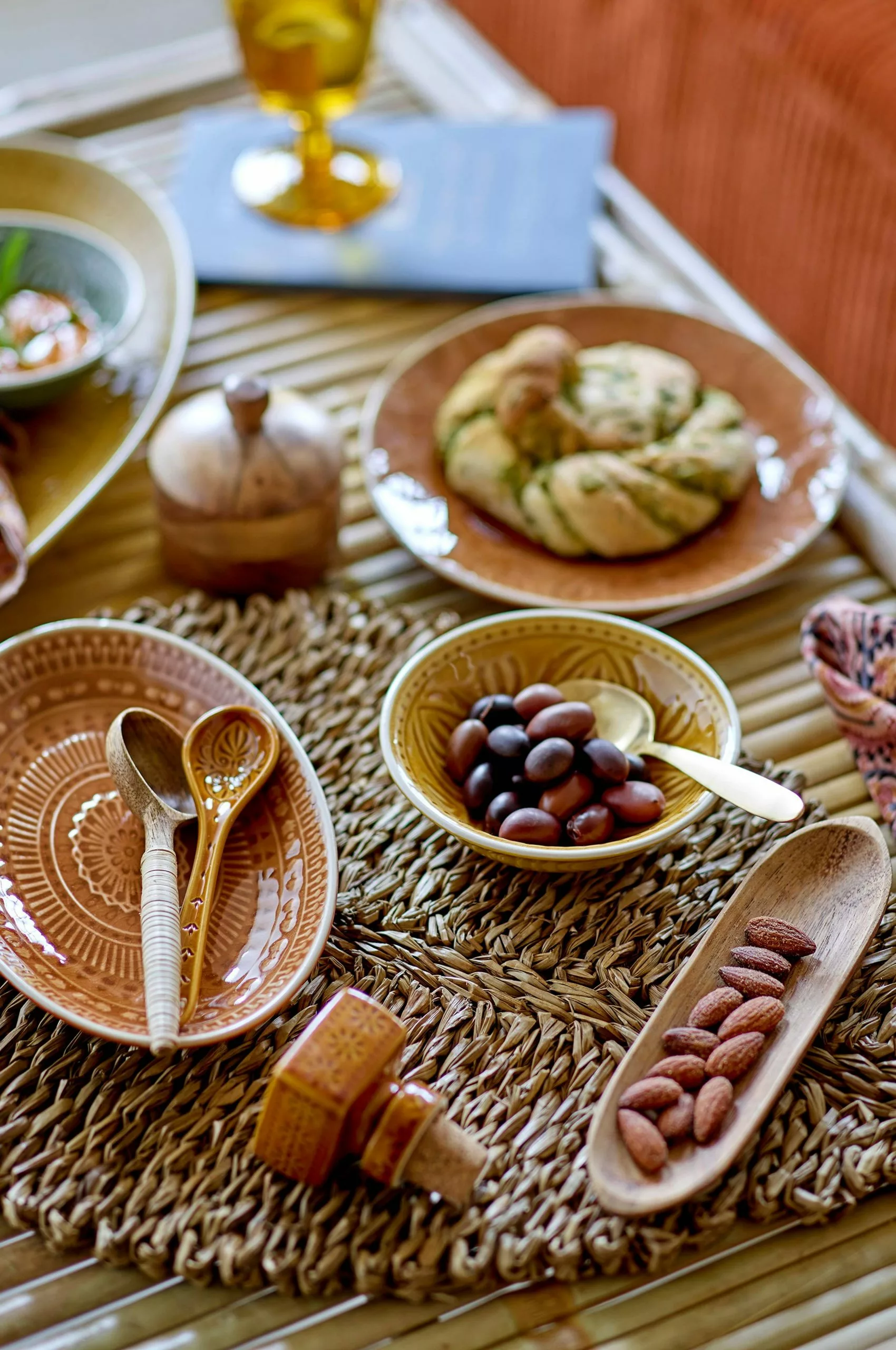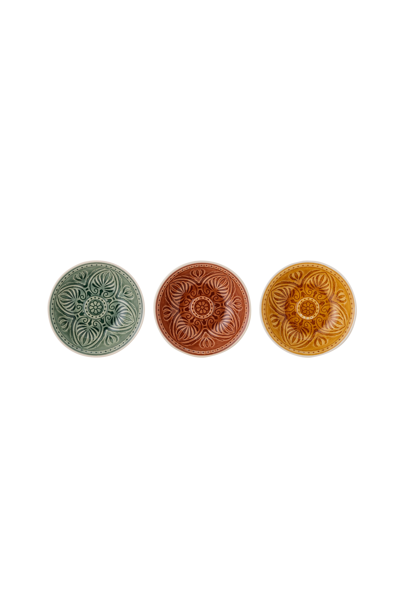 Set med tre tallrikar Bloomingville. Tillverkade av stengods med sött retromönster i grön, gul och brun färg. På grund av glaseringen kan färgerna variera. Tål maskindisk.