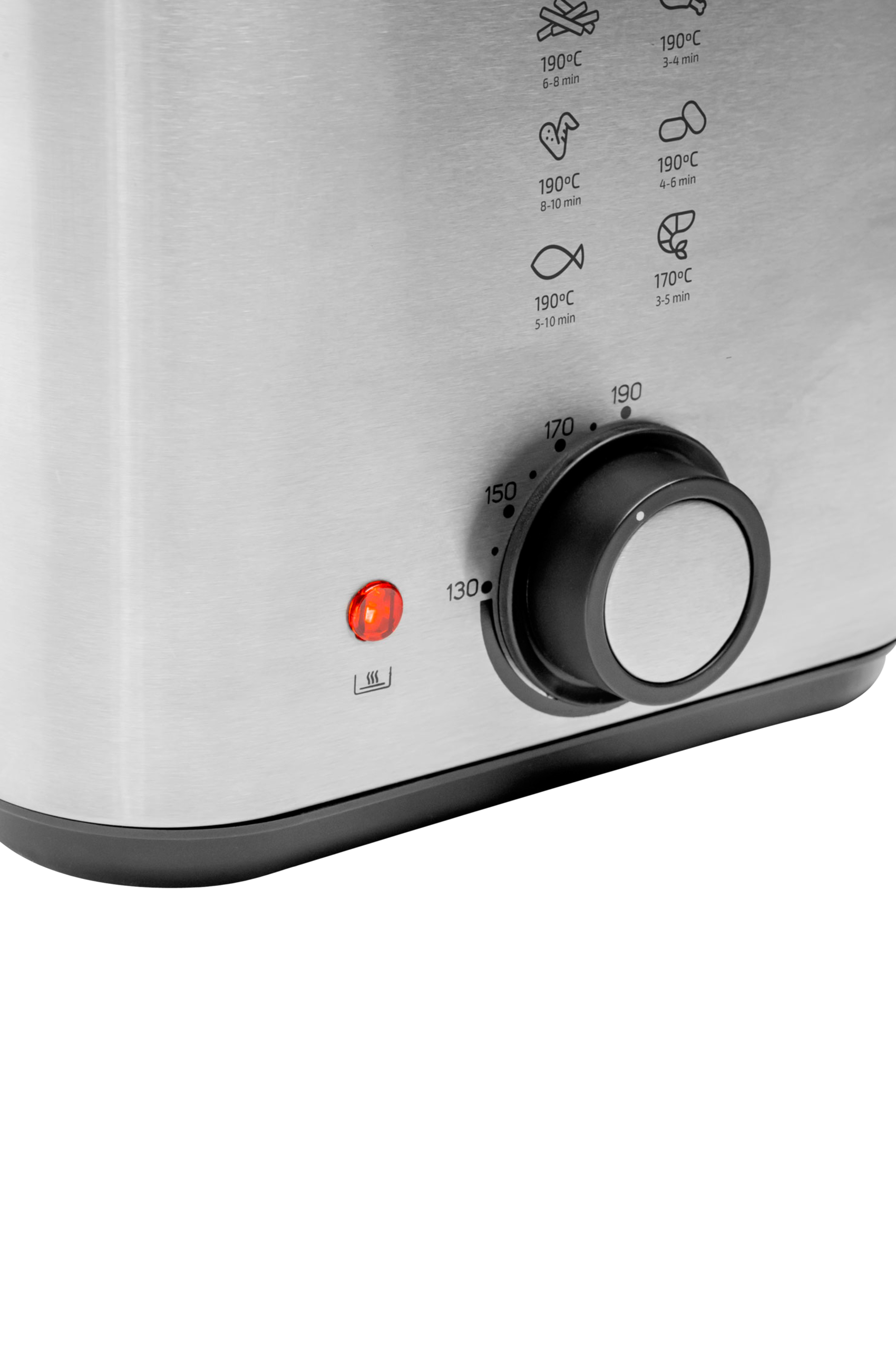 Champions Fritös har en volym på 1,5 L och en kompakt design, perfekt anpassad det mindre hushållet, eller till dig som friterar lite och sällan. Tillaga enkelt pommes, kycklingvingar, lökringar – bara fantasin sätter gränser. Fritösen är tillverkad i rostfritt stål och med den tydliga termostaten ställer du enkelt in önskad värme, 130-190°C.