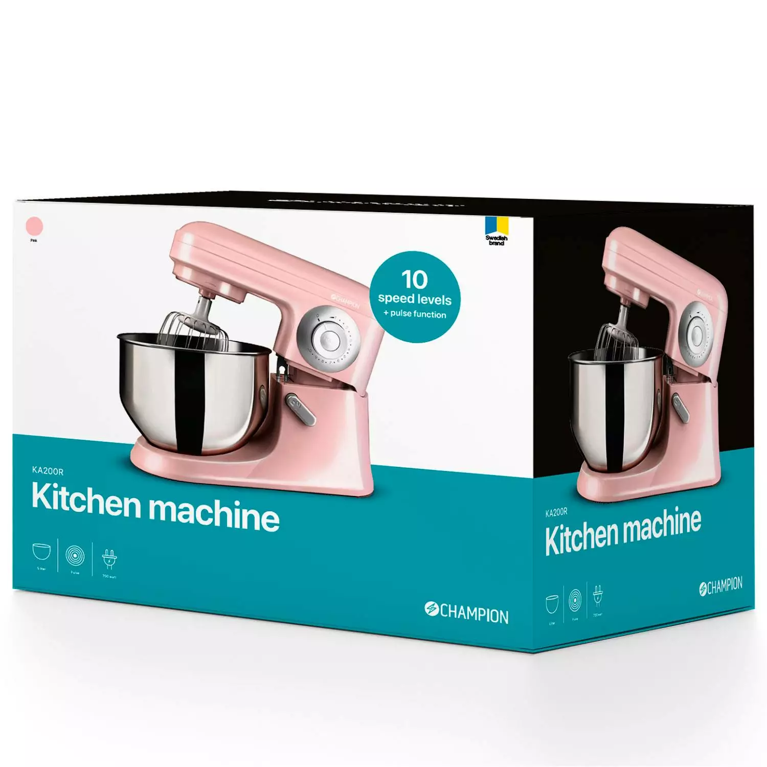 Champion CHKA200 är en kraftfull och stilren köksmaskin som passar in perfekt i alla hem. Oavsett om du älskar att baka eller bara vill ha hjälp med att vispa grädde är denna maskin ett utmärkt val. Med sin stabila konstruktion och non-slip fötter står maskinen alltid stabilt på underlaget oavsett hastighet och belastning.