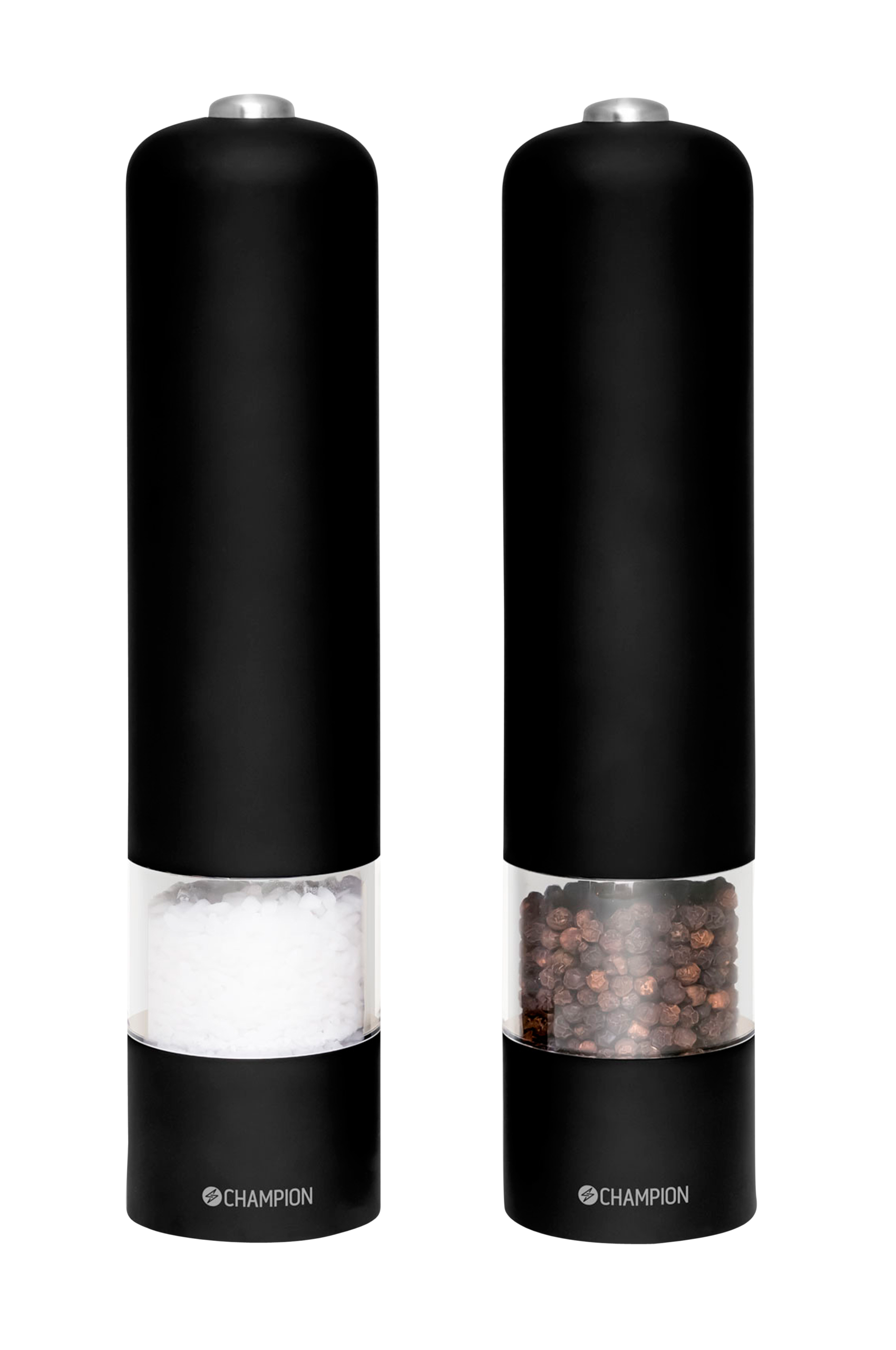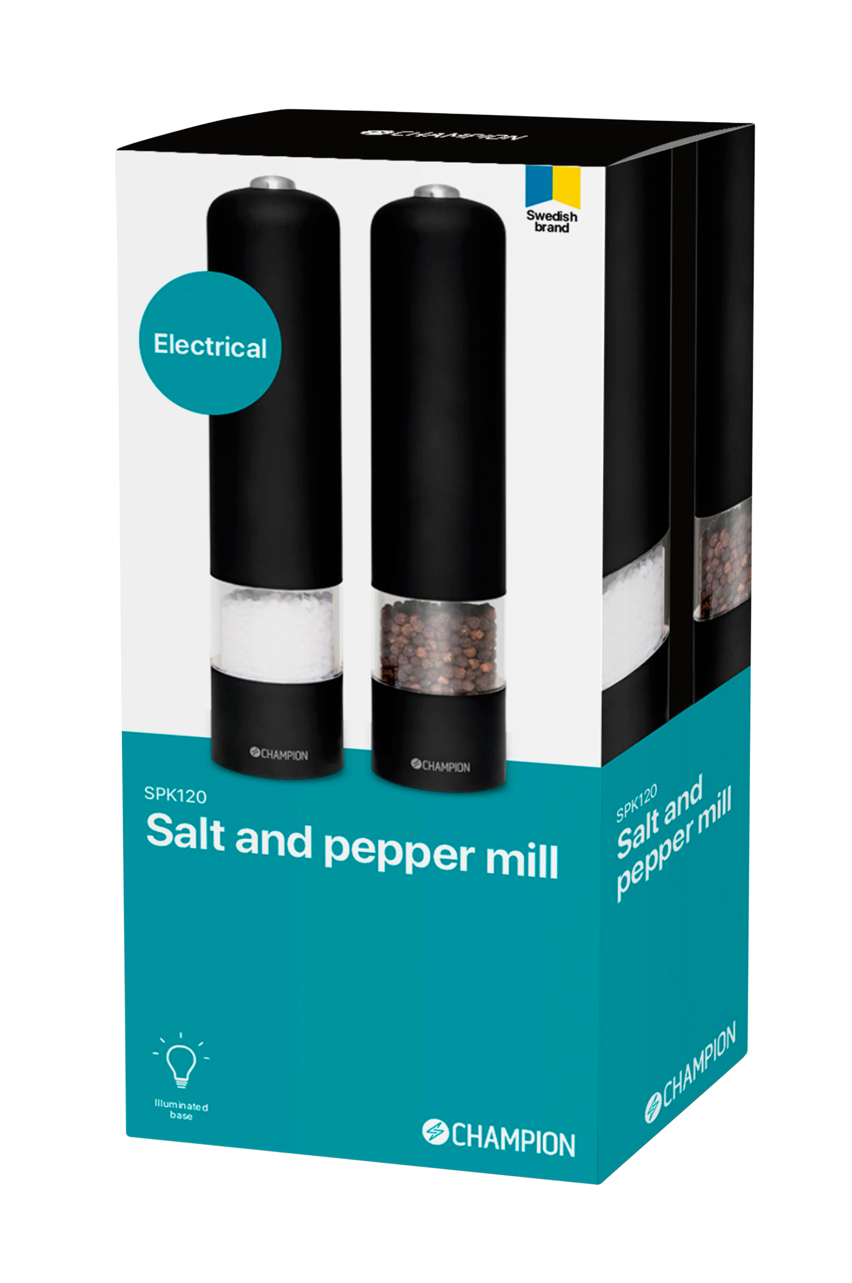 Med Champion elektriska salt & pepparkvarn är nymalda kryddor bara ett handtryck borta. Salt & pepparkvarnen är enkla att fylla på och är utrustade med en praktisk belysning i botten som startar automatiskt vid malning. Den stilrena designen passar både för köksbänken och direkt på bordet. Drivs med 4 AA-batterier.