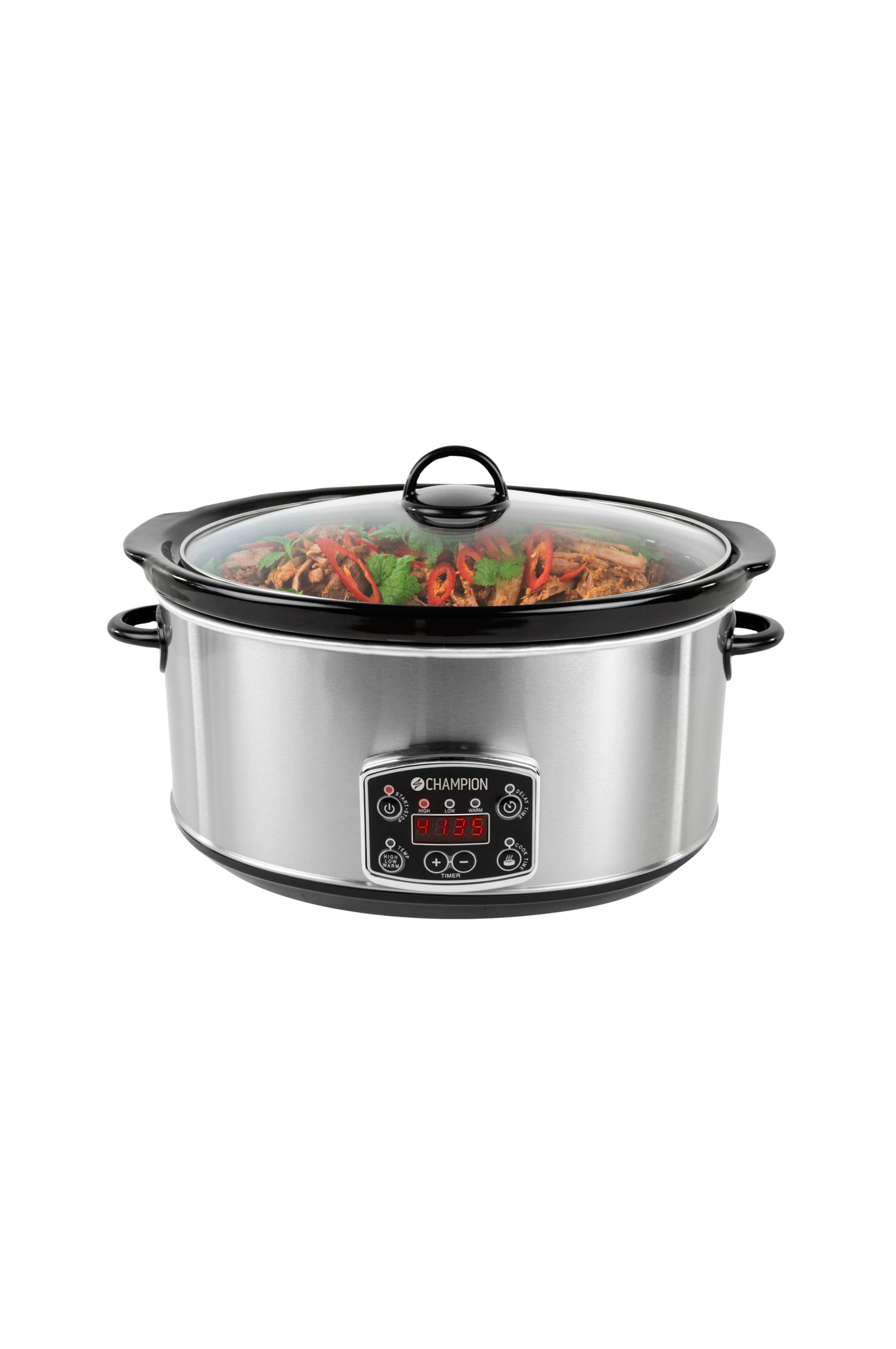 Att laga mat i en slowcooker är otroligt enkelt. Du behöver inte vara någon mästerkock för att lyckas i köket med Champion CHSC210 tillhands. Lägg i dina ingredienser i grytan, starta värmen och sedan kan du låta slowcookern göra jobbet, medan du lägger tid på annat. Champion CHSC210 har även programmerbar starttid, vilket innebär att du kan bestämma när maten ska börja tillagas. En annan fördel är att maten får en varsam tillagning vilket bevarar smaker och näringsämnen på bästa möjliga sätt. Med den digitala inställningspanelen väljer du enkelt värmeinställning och ställer in timern på önskad tillagningstid. Med sin rymliga volym på 6.5 liter får du plats med mat även till den större middagsbjudningen. – Oval Slowcooker på 6.5 liter – Uttagbar keramisk gryta – Två värmeinställningar – LCD Display – Tempererat glaslock – 12 timmars digital timer – Programmerbar starttid (Delayed time control)