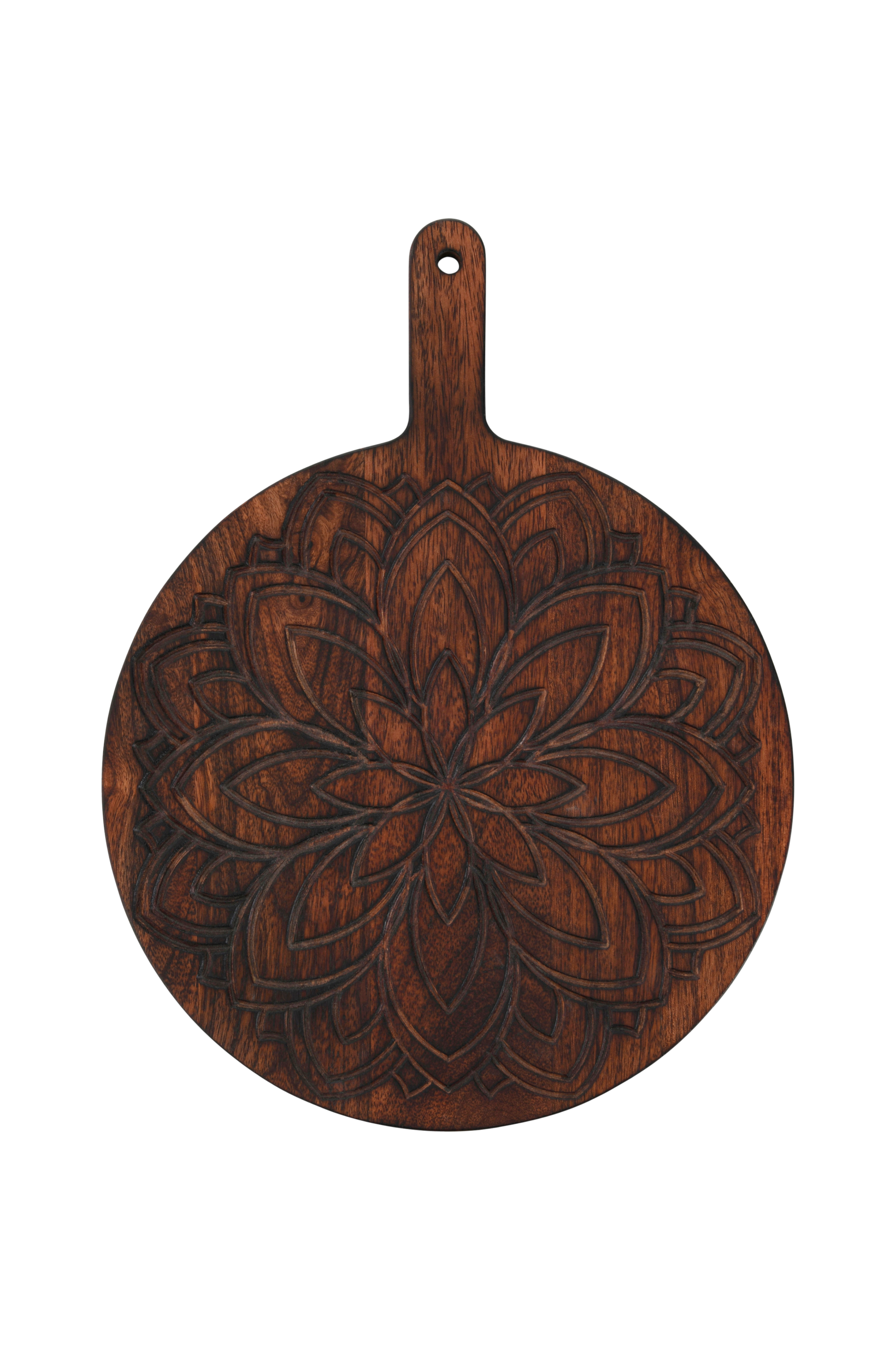 Skärbräda av mangoträ med vaxad finish. Utskuret mönster på framsidan. Handtag med hål för upphängning. Handtagets längd 10 cm.