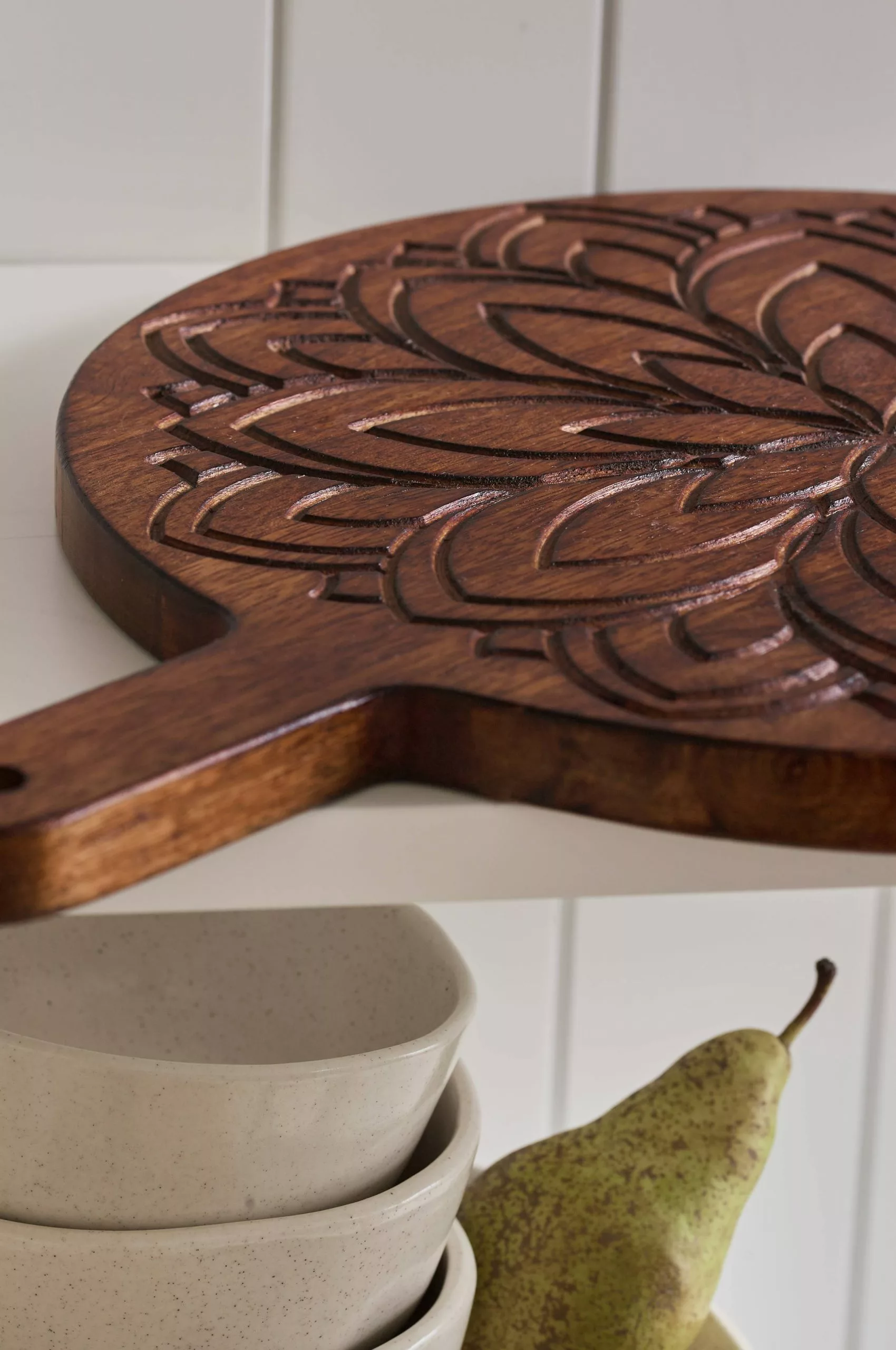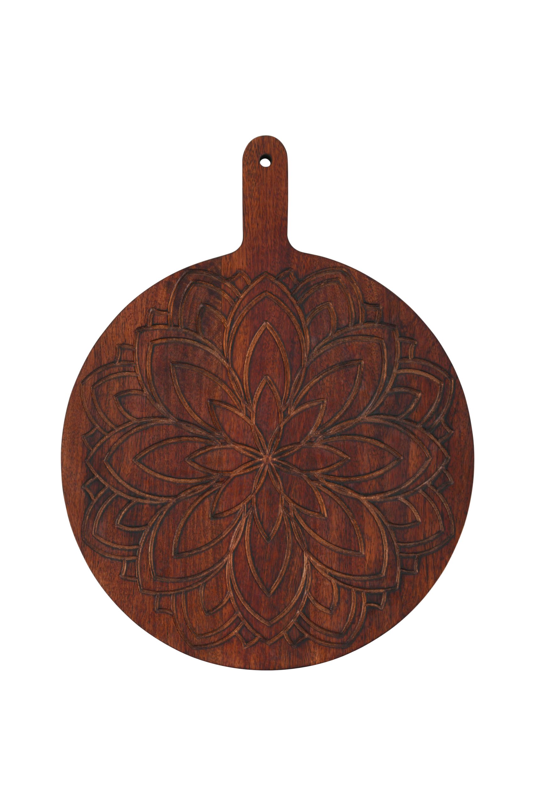Skärbräda av mangoträ med vaxad finish. Utskuret mönster på framsidan. Handtag med hål för upphängning. Handtagets längd 10 cm.