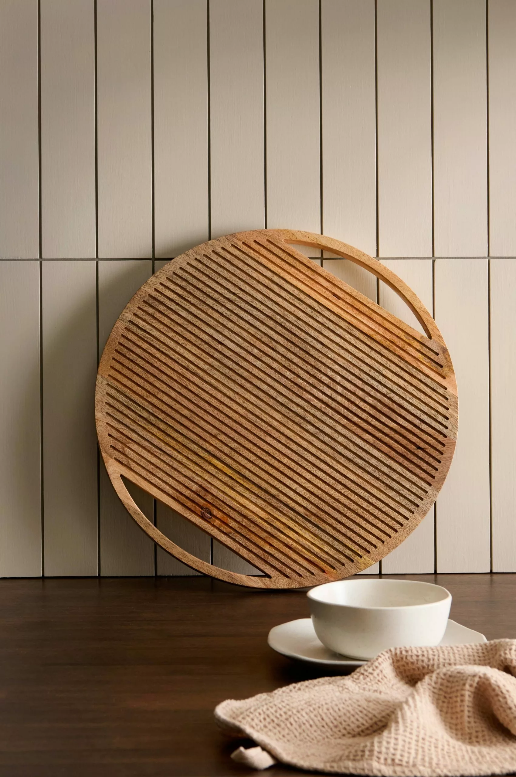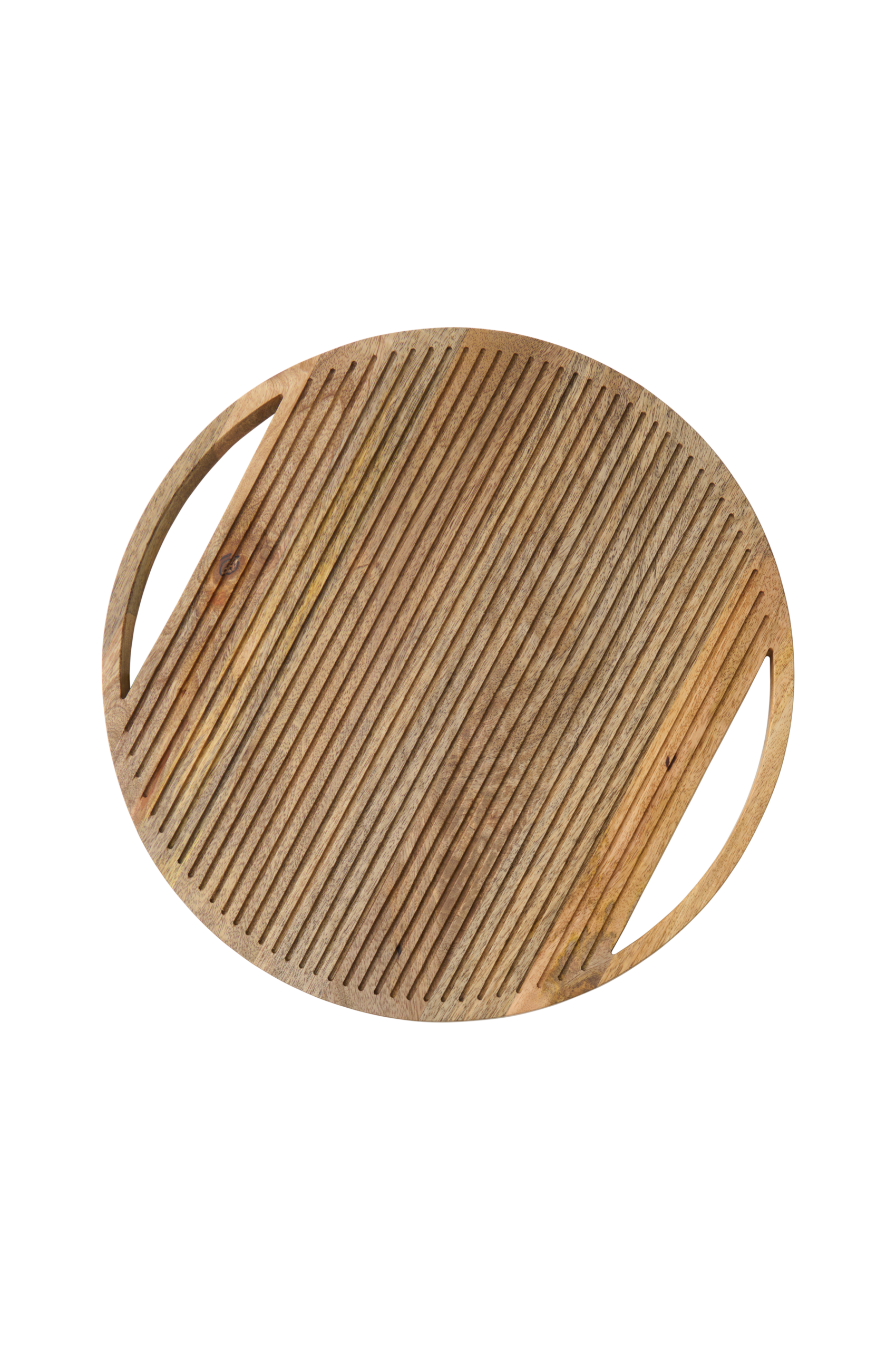 Rund skärbräda i FSC-certifierat mangoträ med behandling som gör den food safe. Räfflat mönster på framsidan och slät baksida.