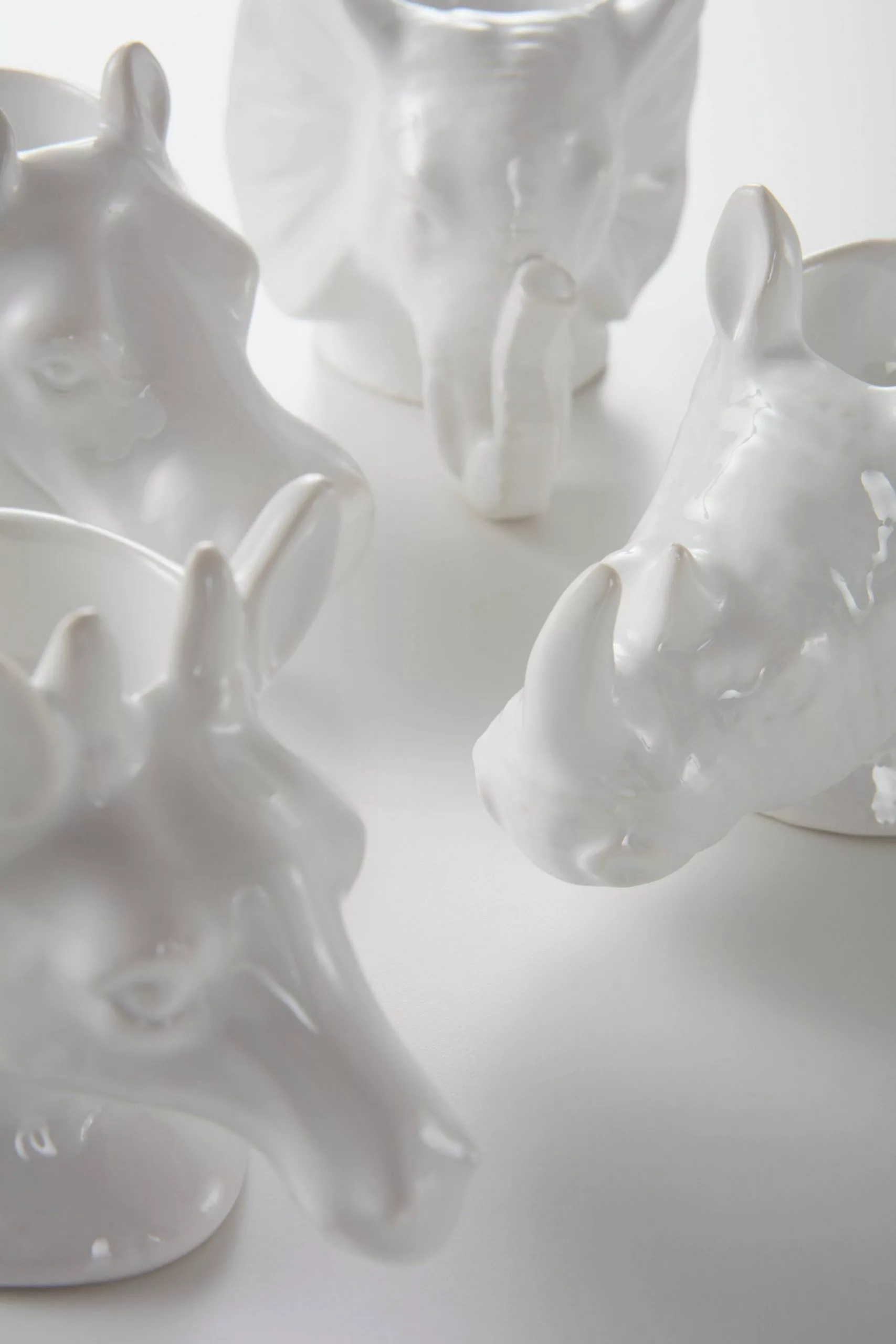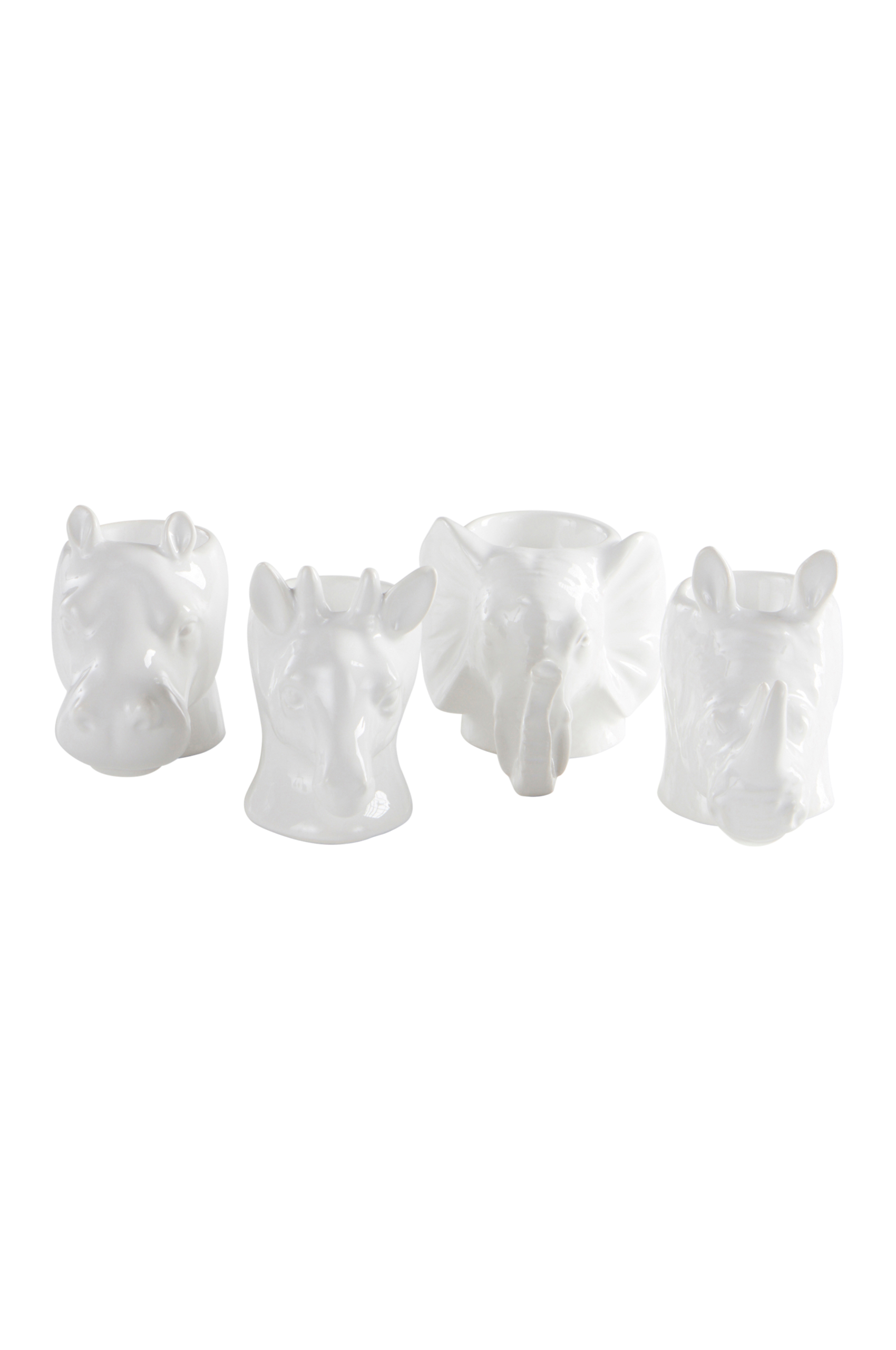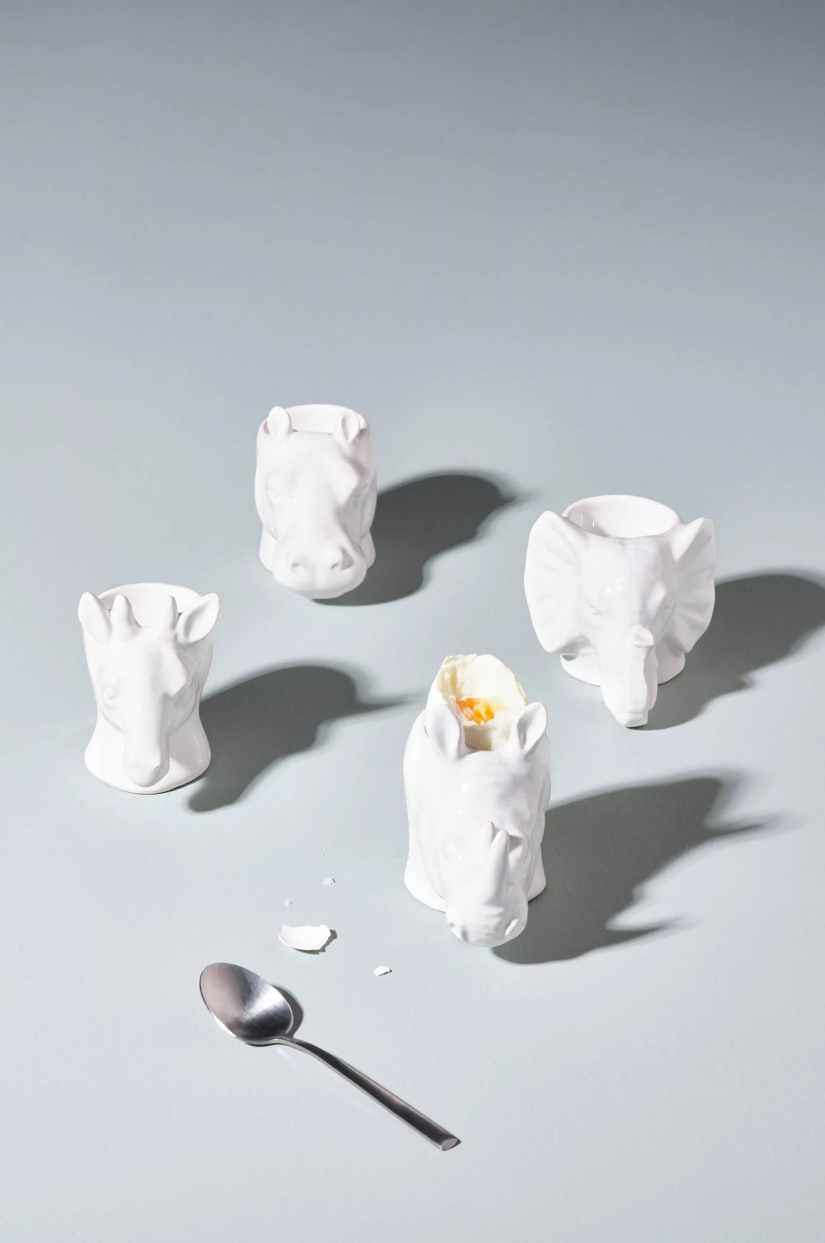4-pack äggkoppar i dolomitporslin. Äggkopparna har en lekfull design i motiv av olika djur: en flodhäst, en elefant, en noshörning och en giraff.