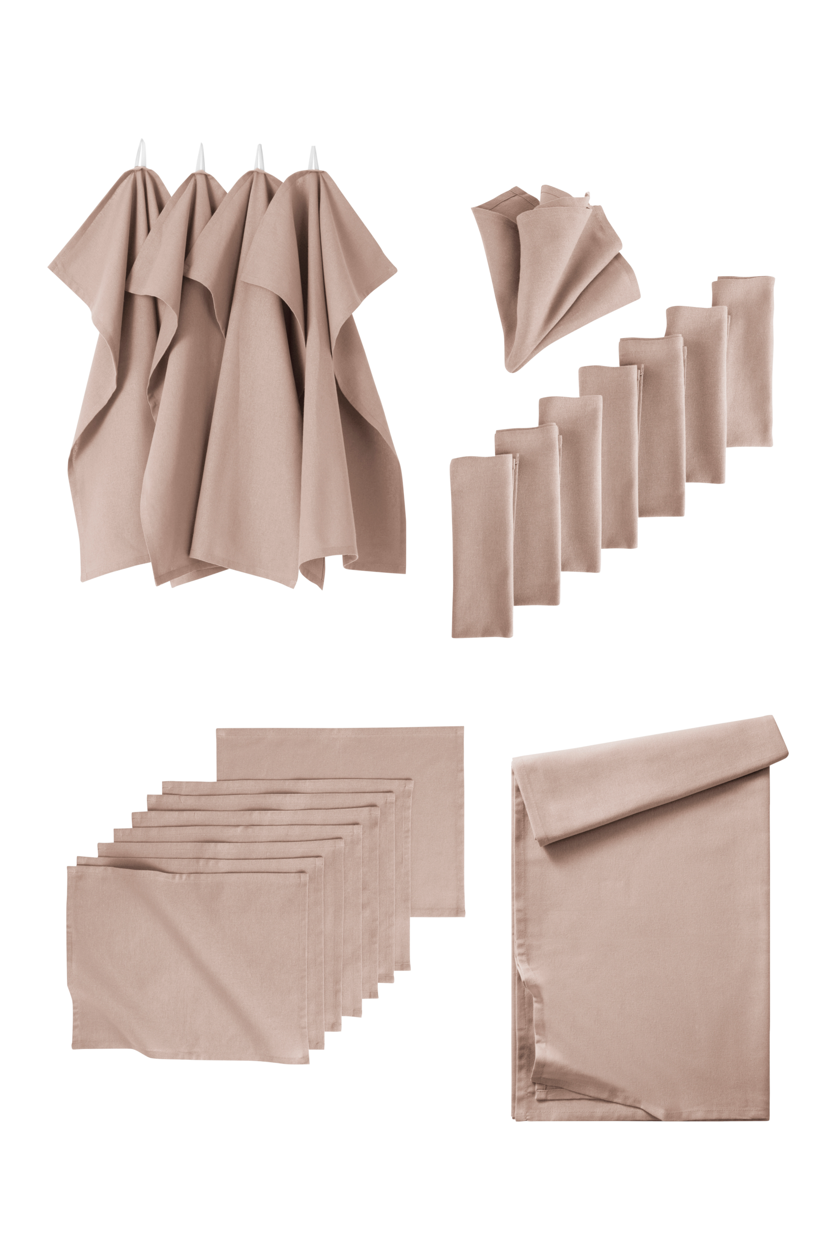 ELORA är ett enfärgat köksset i 21 delar av återvunnen bomull. Det prisvärda setet gör det enkelt för dig att duka enhetligt och snyggt alla dagar i veckan.
