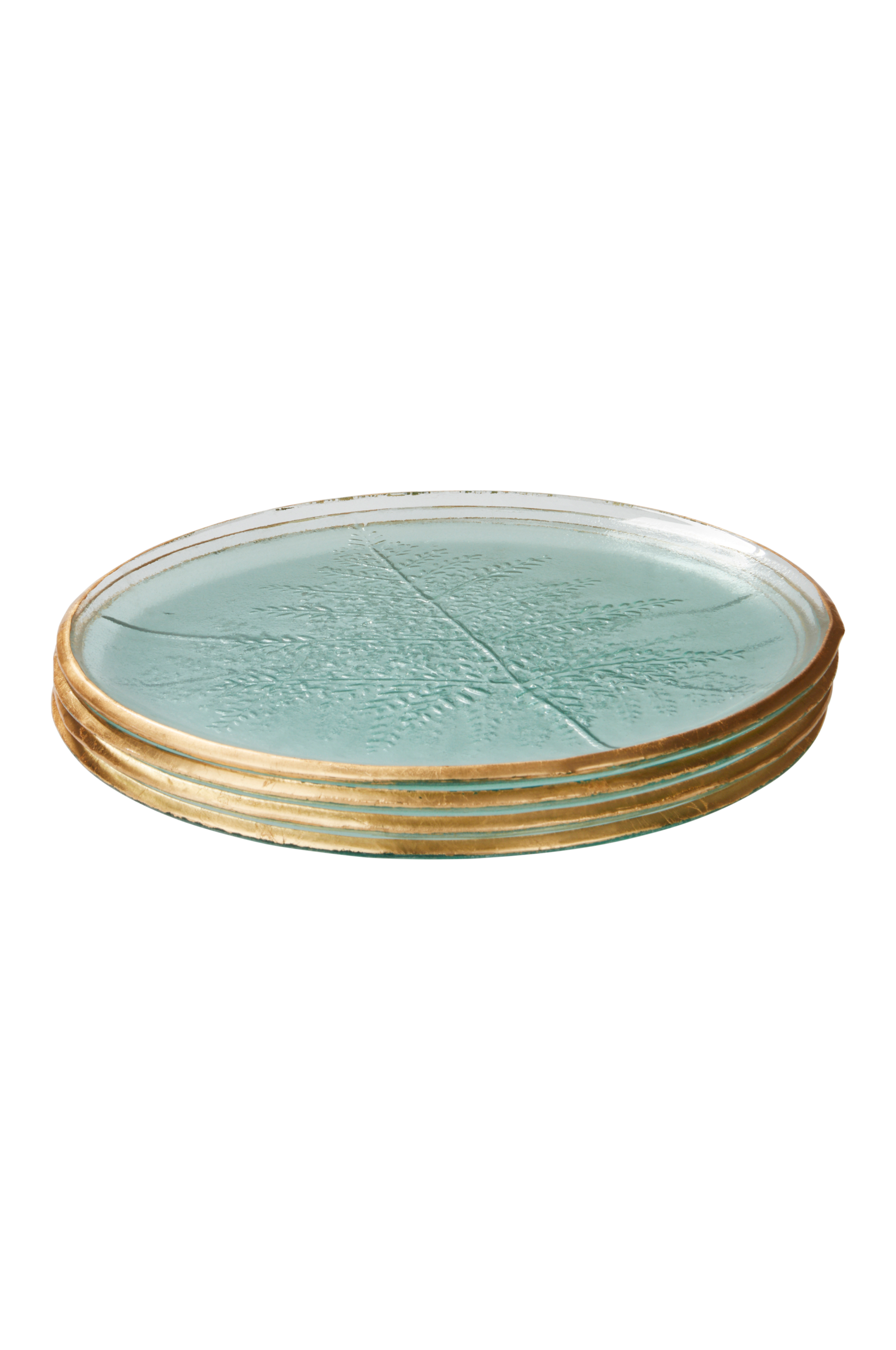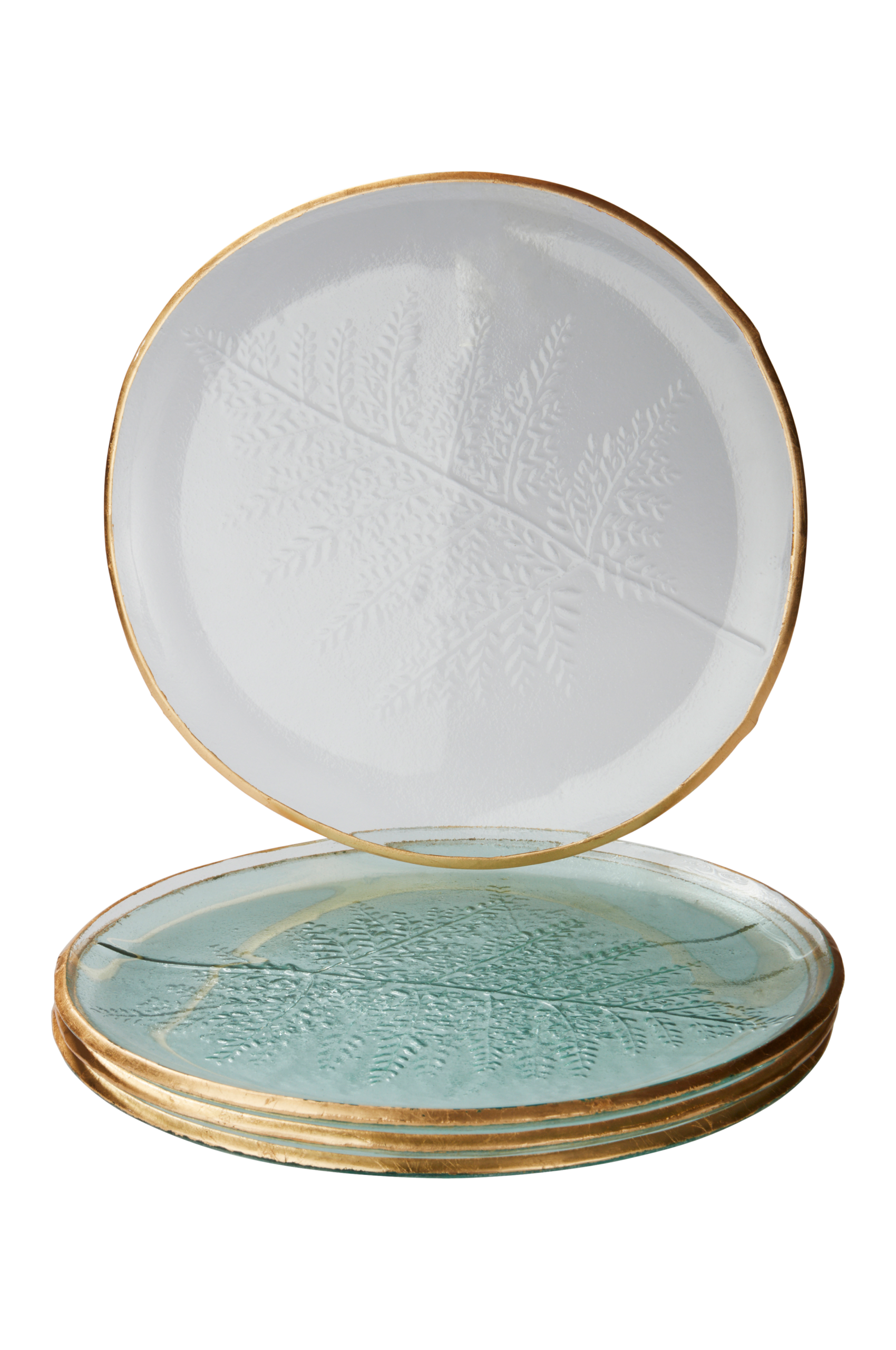 4-pack tallrikar av glas med fint lövmönster och guldfärgad kantning. Mio är en mycket dekorativ tallrik som passar lika fint att servera maten på som att använda som uppläggningsfat, kanske på ett vackert buffébord.