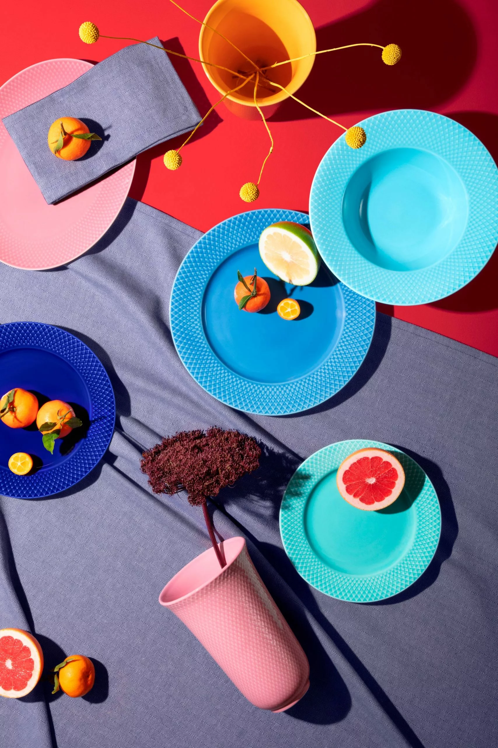 Rhombe Colors karakteristiska och moderna färger har utvecklats i samarbete med designduon Stilleben, som likt Lyngby Porcelæn drivs av en passion för nya idéer och en önskan om att återupptäcka och ompröva det keramiska arvet. Dettta är ett helt nytt serveringsfat i porslin som är 28,5 cm långt och därmed något mindre än det befintliga lila fatet i serien. Formen är oval och den lilla storleken är perfekt för att servera mindre rätter, godis, ett fruktfat eller som bas för ett dekorativt arrangemang. Design Stilleben