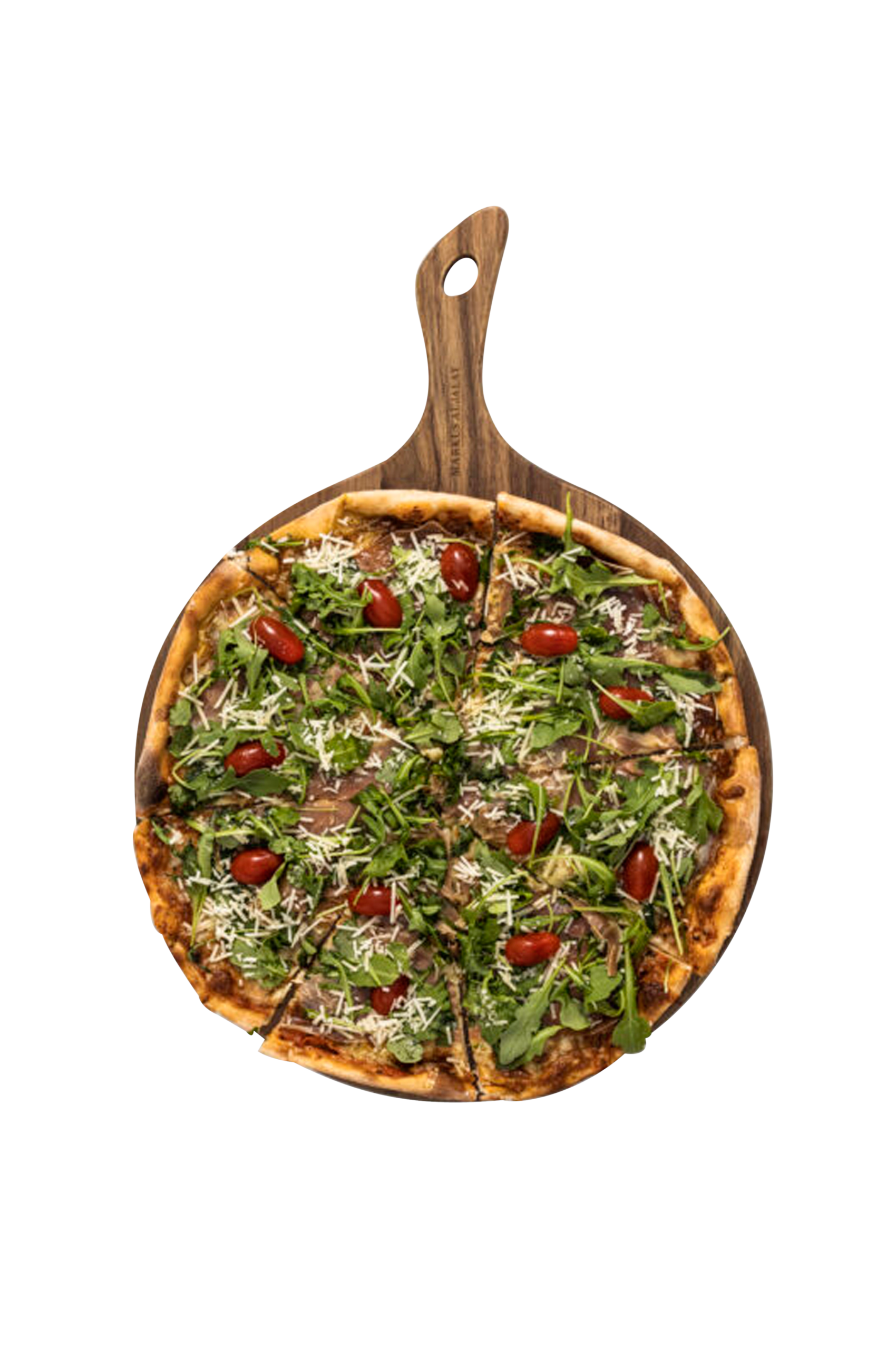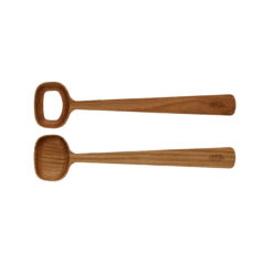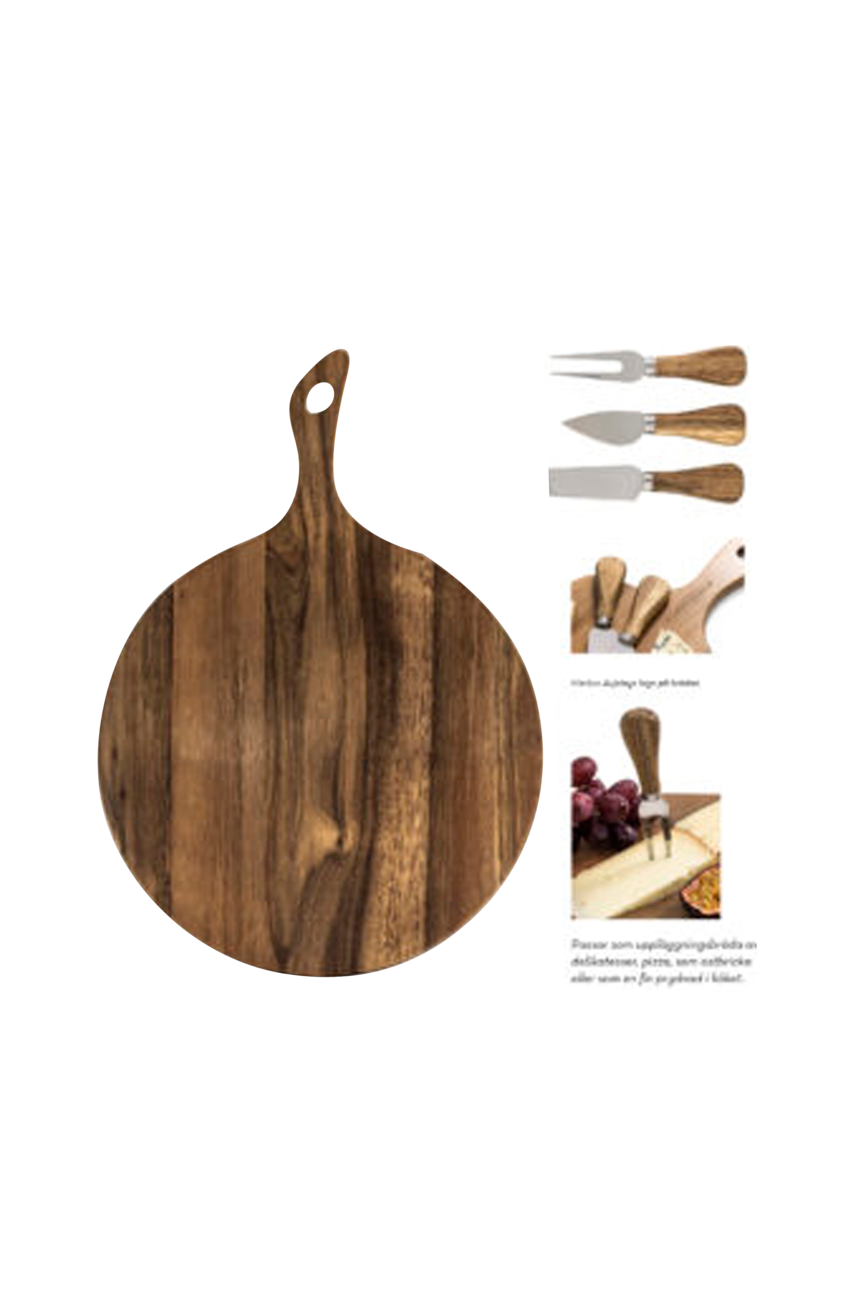 Trendig skärbräda/ostbräda i akaciaträ med handtag och tre ostbestick. Brädan passar som uppläggningsbricka av ostar, tapas och andra delikatesser.