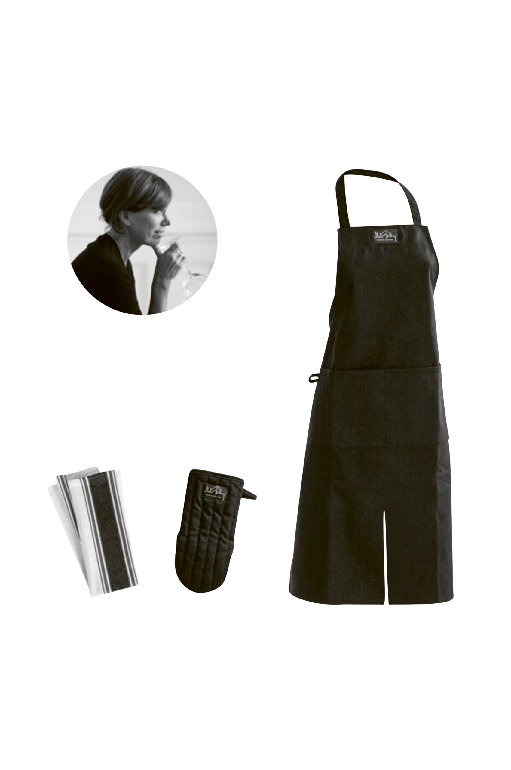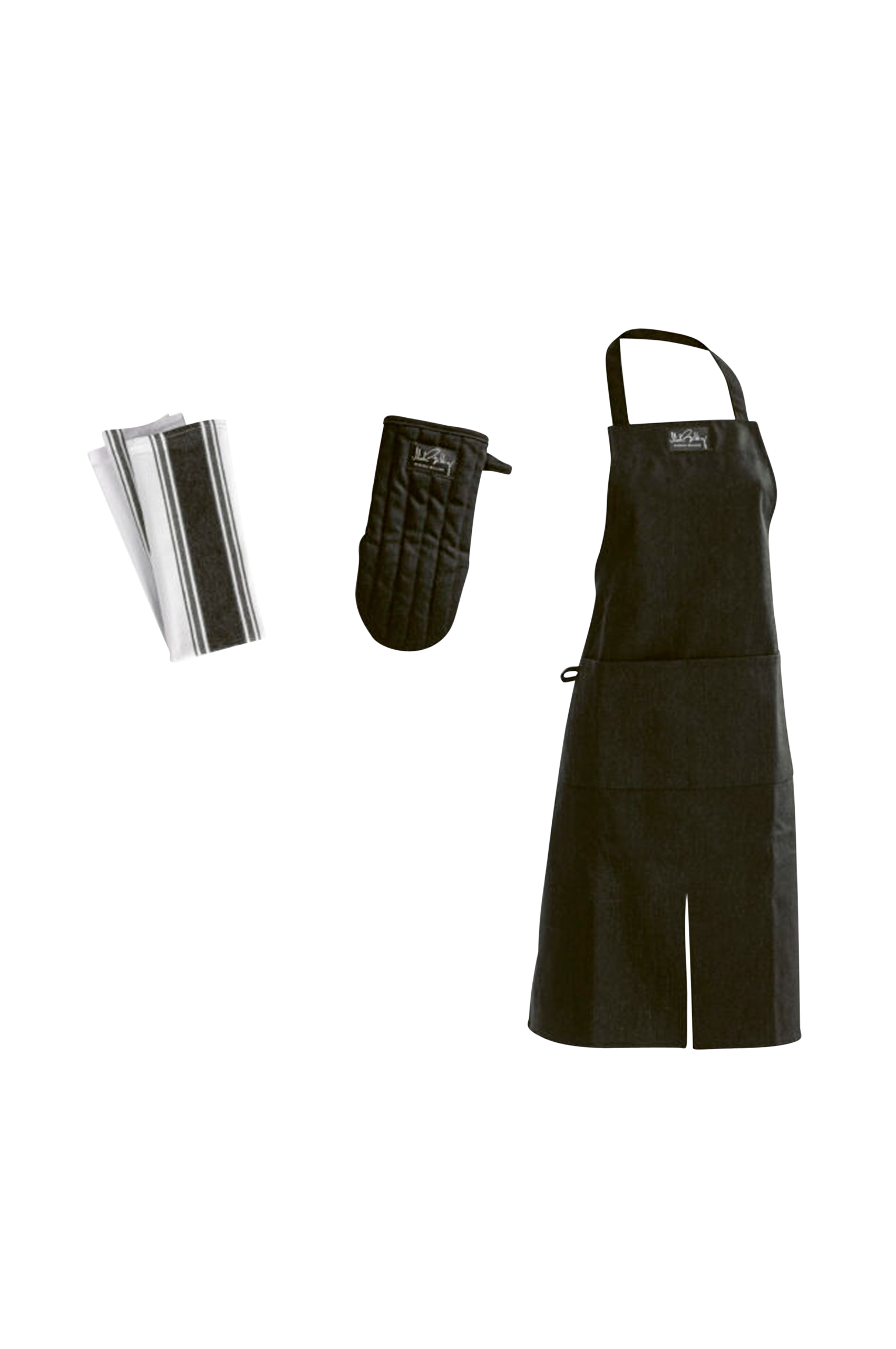 i nackbandet och har en frontficka samt en ögla där du kan hänga kökshandduken. Grytvanten är av samma höga kvalitet som förklädet och kökshandduken är i 100% bomull.