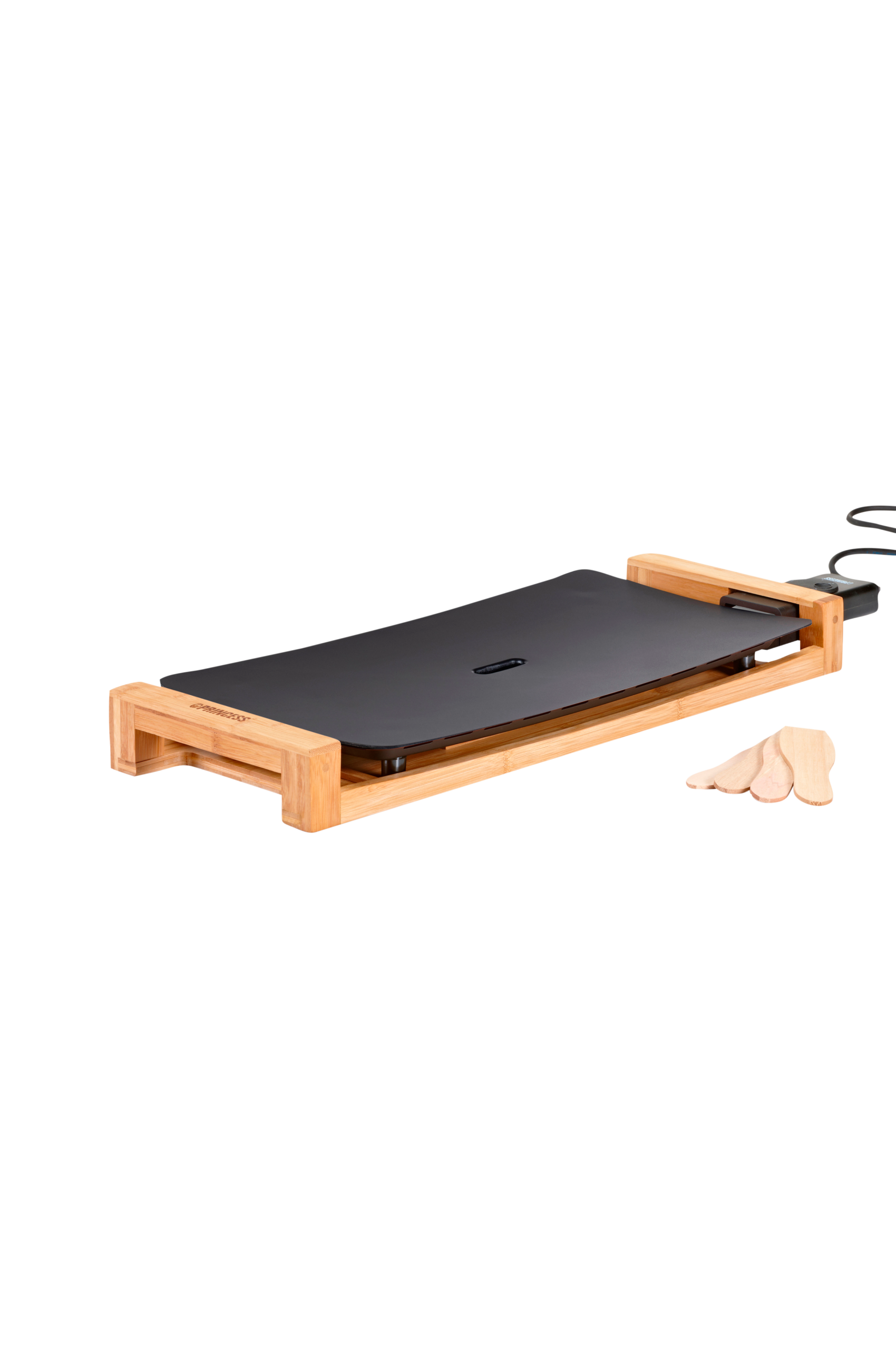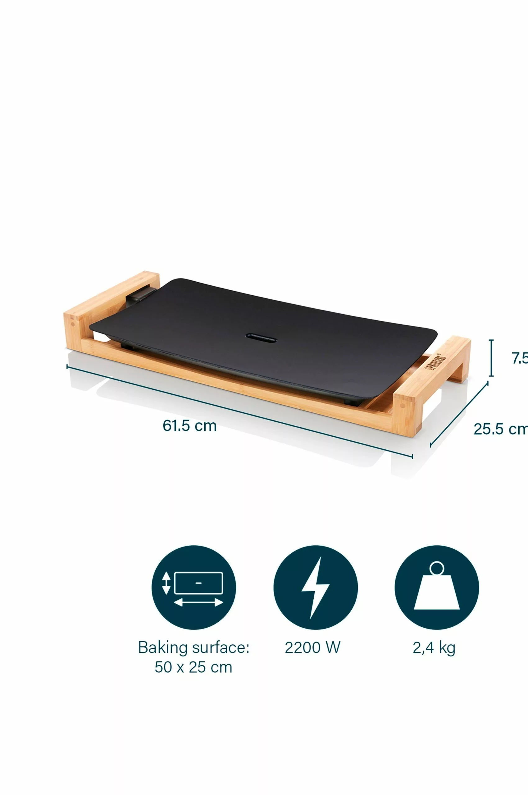 Överraska och duka med denna lyxiga bordsgrill. Tack vare den stora grillytan på 50 x 25 cm kan du äta med din familj eller vänner. Den gjutna aluminiumbeläggningen ger perfekta värmefördelningen och den sluttande designen fångar allt fett i fettbehållaren, vilket gör din mat ännu mer hälsosam. Det betyder att användningen av smör eller olja inte längre är nödvändig för att baka en utsökt bit kött eller fisk. Material av bambu ser till att bordsgrillen är lätt att flytta på grund av att huset förblir svalt. Specifikationer: – 2200W – Övre ytmaterial i aluminium – Grillytans storlek B50 x D25 cm – Antal personer 6 – Justerbar termostat – Svala beröringshandtag – Halkfria fötter – Löstagbar nätsladd – längd 2m – Non-stick beläggning
