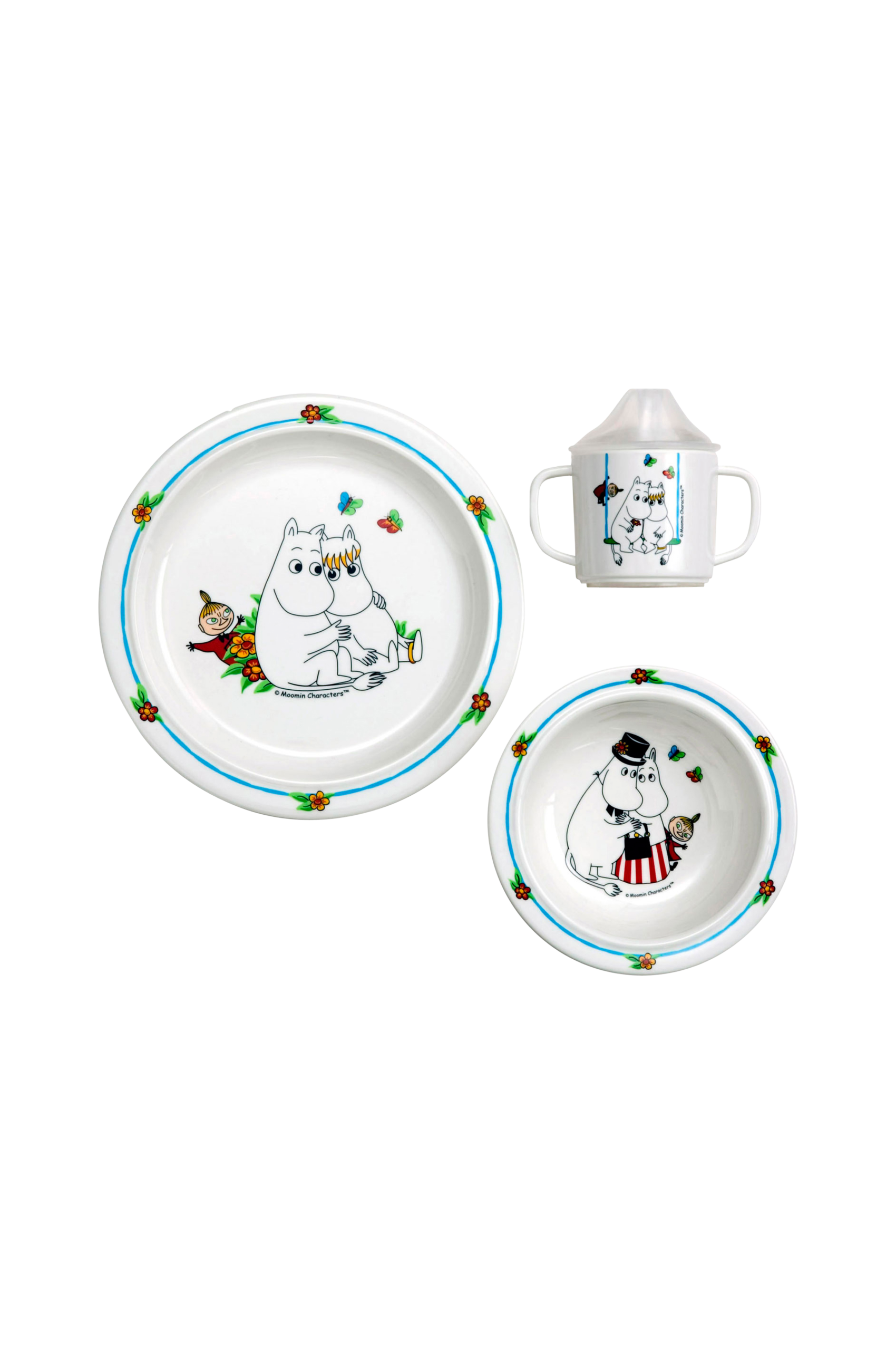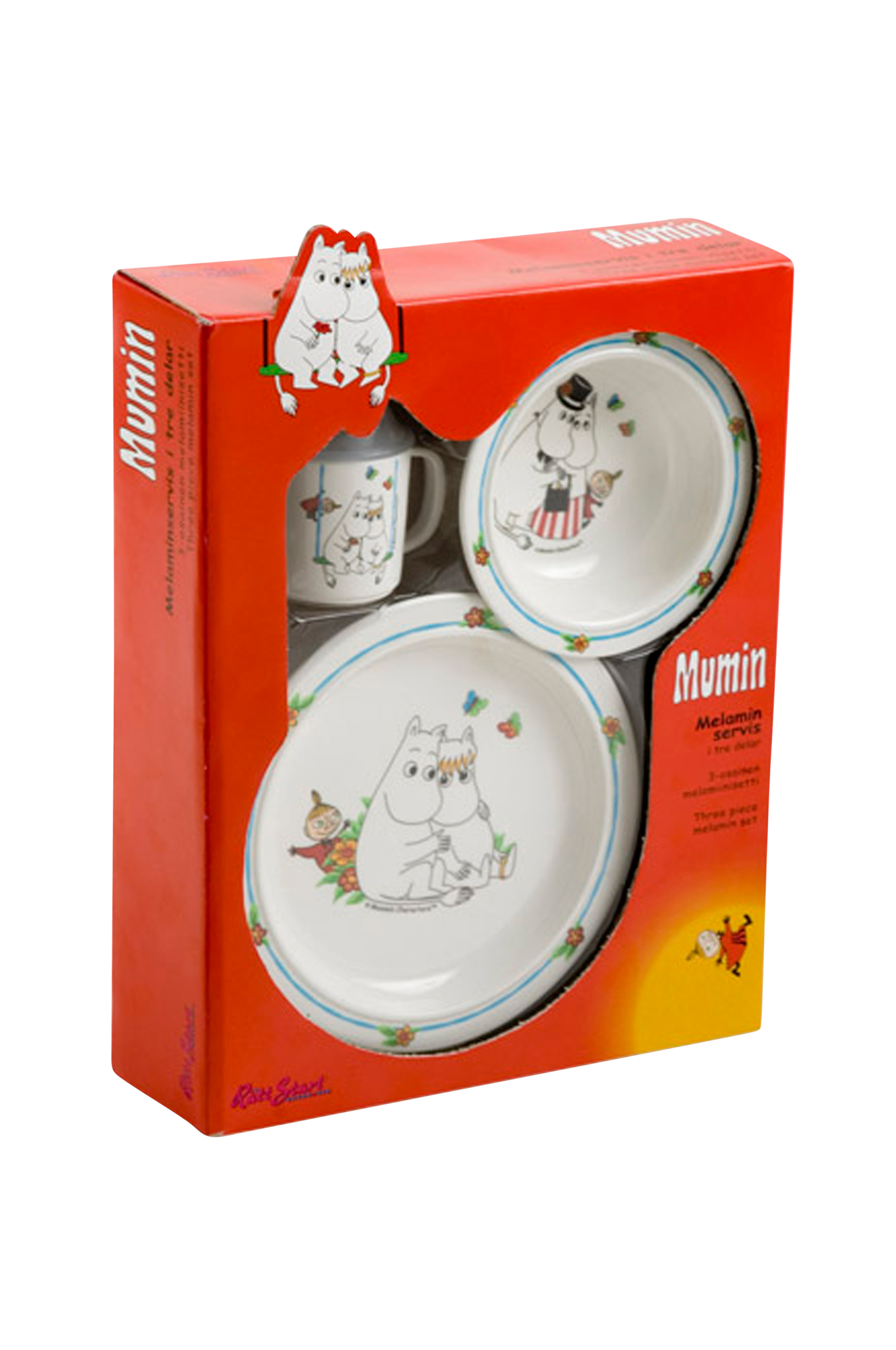 Service Mumin i tre delar, innehåller stor tallrik, praktisk sugkoppstallrik och pipmugg med lock. Tålig barnservis i repsäker melaminplast med motiv av Mumin. Antiglidring under muggen och den flata tallriken. Djup tallrik med sugkopp och spillsäker mugg med handtag. Alla delar tål maskindisk i övre hyllan och uppvärmning i mikrovågsugn (1 min , 800W) Levereras i en praktisk presentkartong.