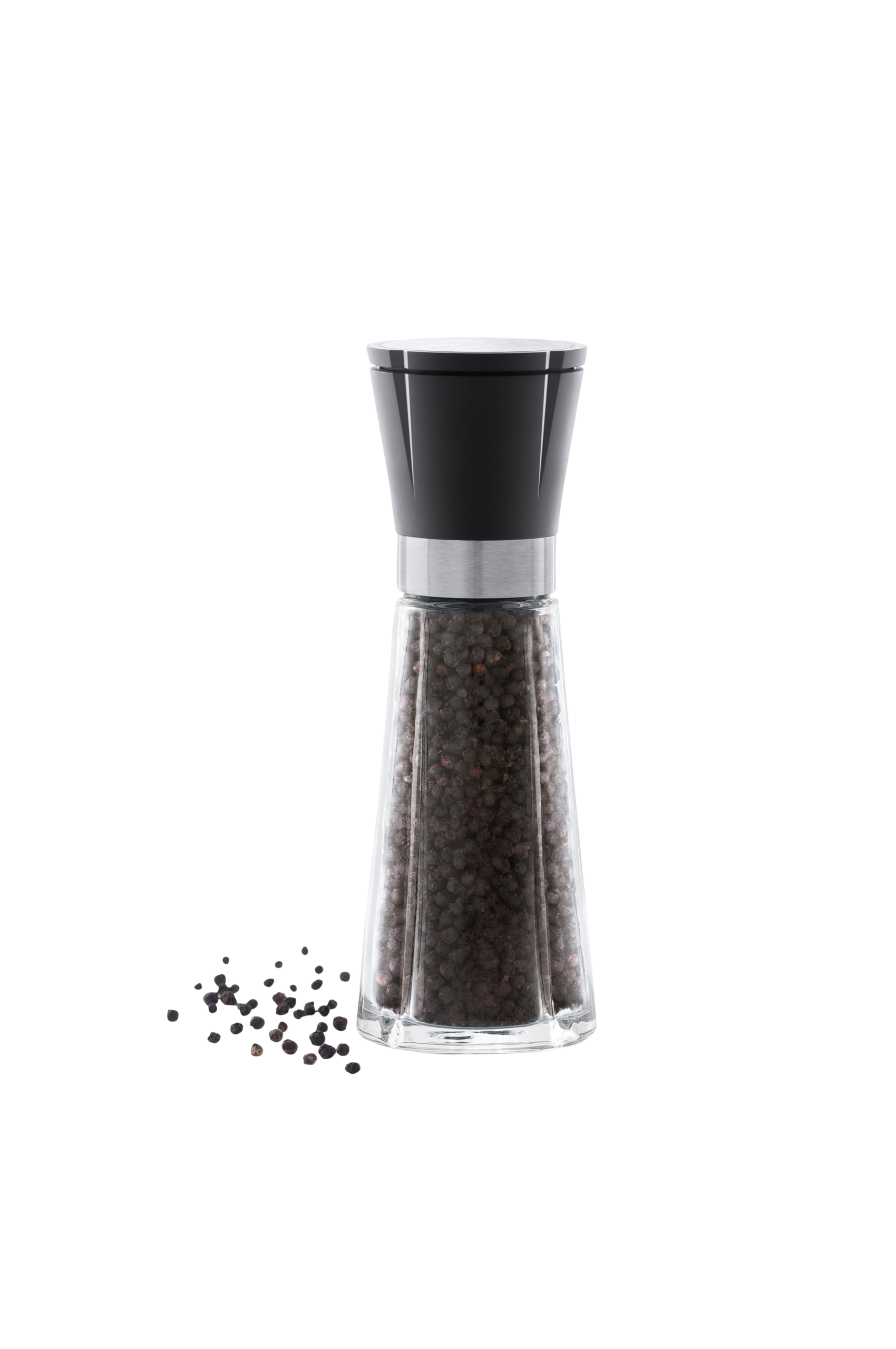 Pepparkvarnens keramiska malverk är placerat i toppen så att du slipper peppar på duken. Kvarnen kan ställas in på att mala fint eller grovt. Den fungerar efter samma princip som en mortel som stöter smaken ur pepparn. Det är 25 års garanti på kvarnen.