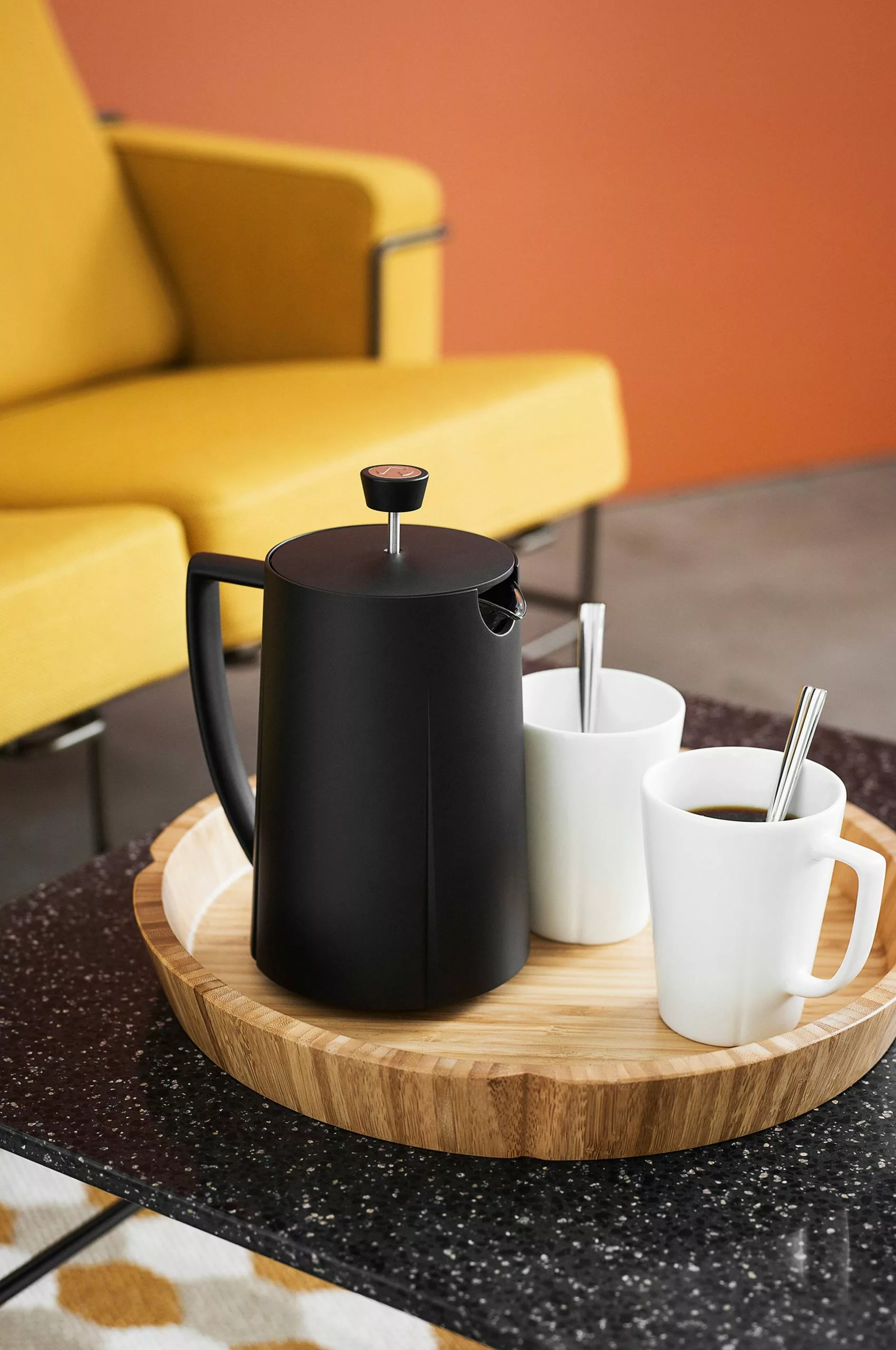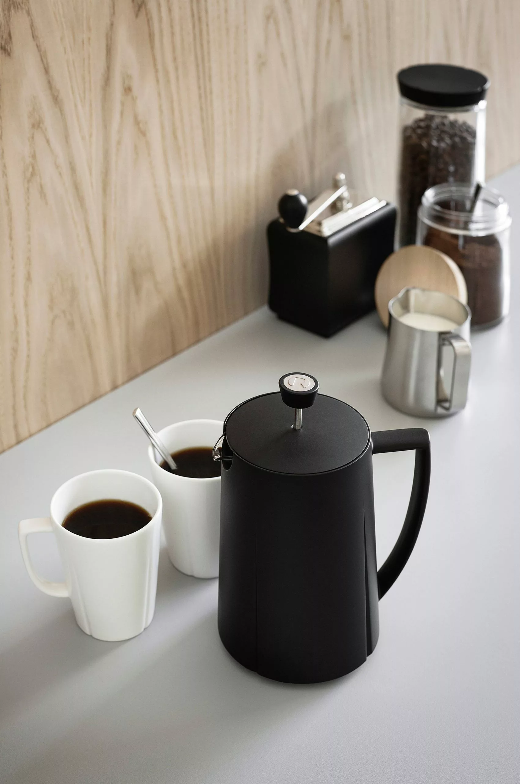 Den enkla och vackra presskannan Rosendahls Grand Cru-serie är tillverkad i svart plast – samma material som den kända GC termoskannan. Glasinsatsen i kannan är gjord av borosilikat och tål diskmaskin. Rymmer 1 liter, motsvarande 8 koppar kaffe.