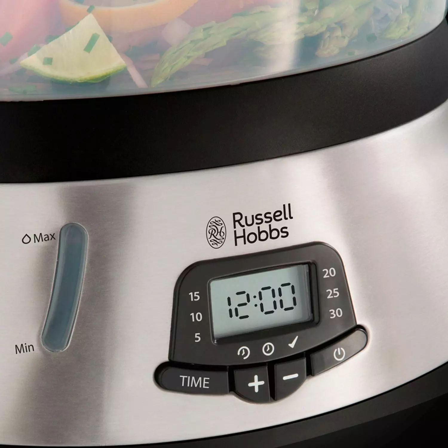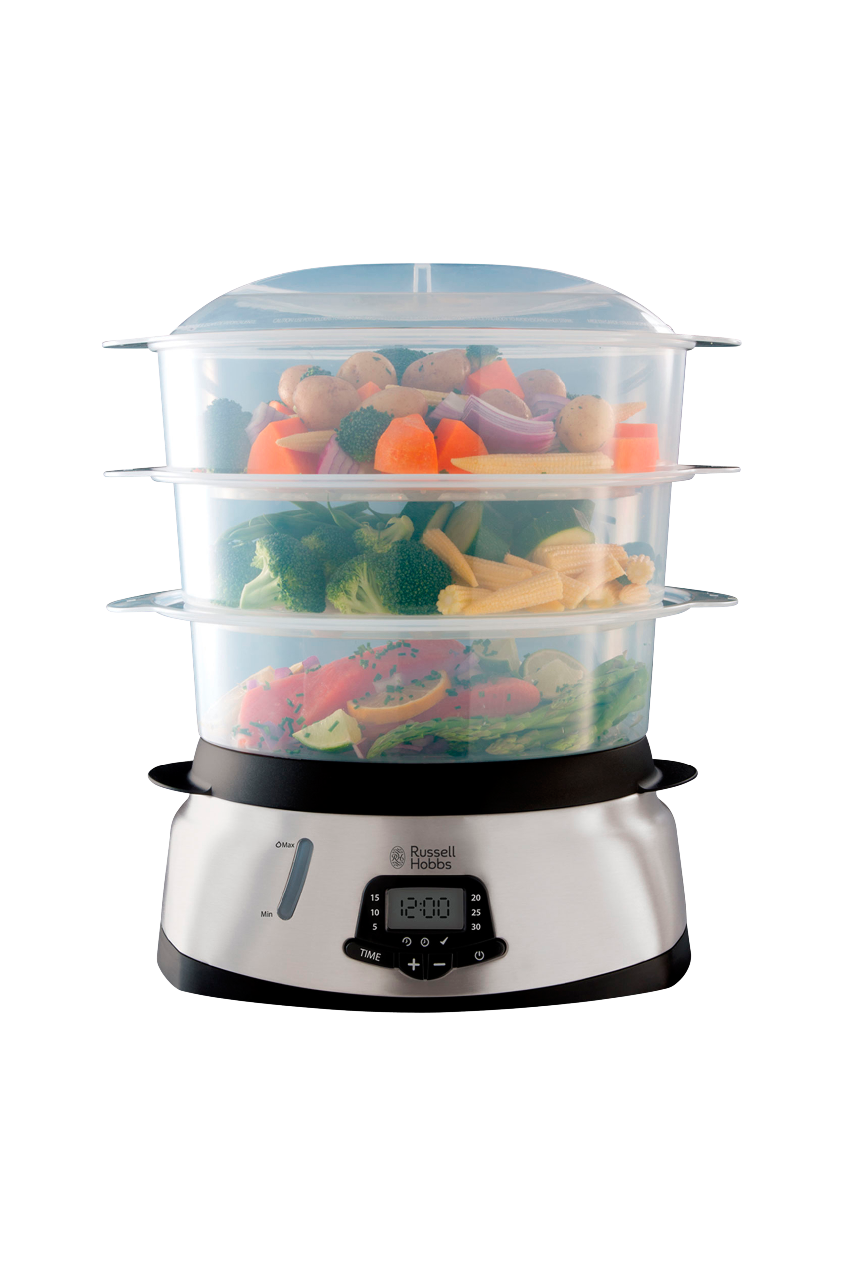 Vår MaxiCook ångkokare har hela 10,5 liters kapacitet och med de tre behållarna tillverkade i BRA fri plast kan du tillaga hela måltiden på en och samma gång. Tack vare den digitala timern kan du själv bestämma när ångkokaren ska påbö…