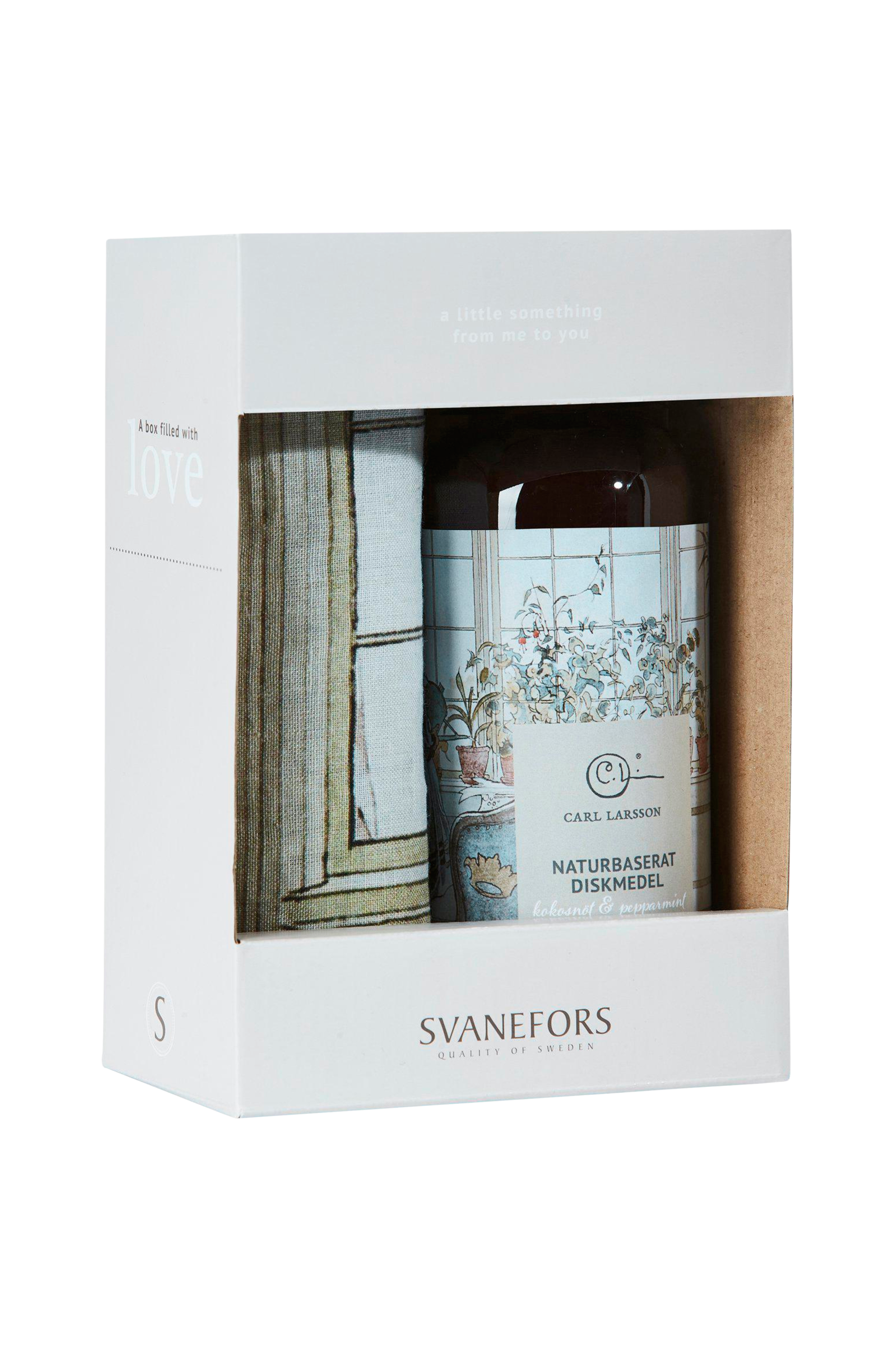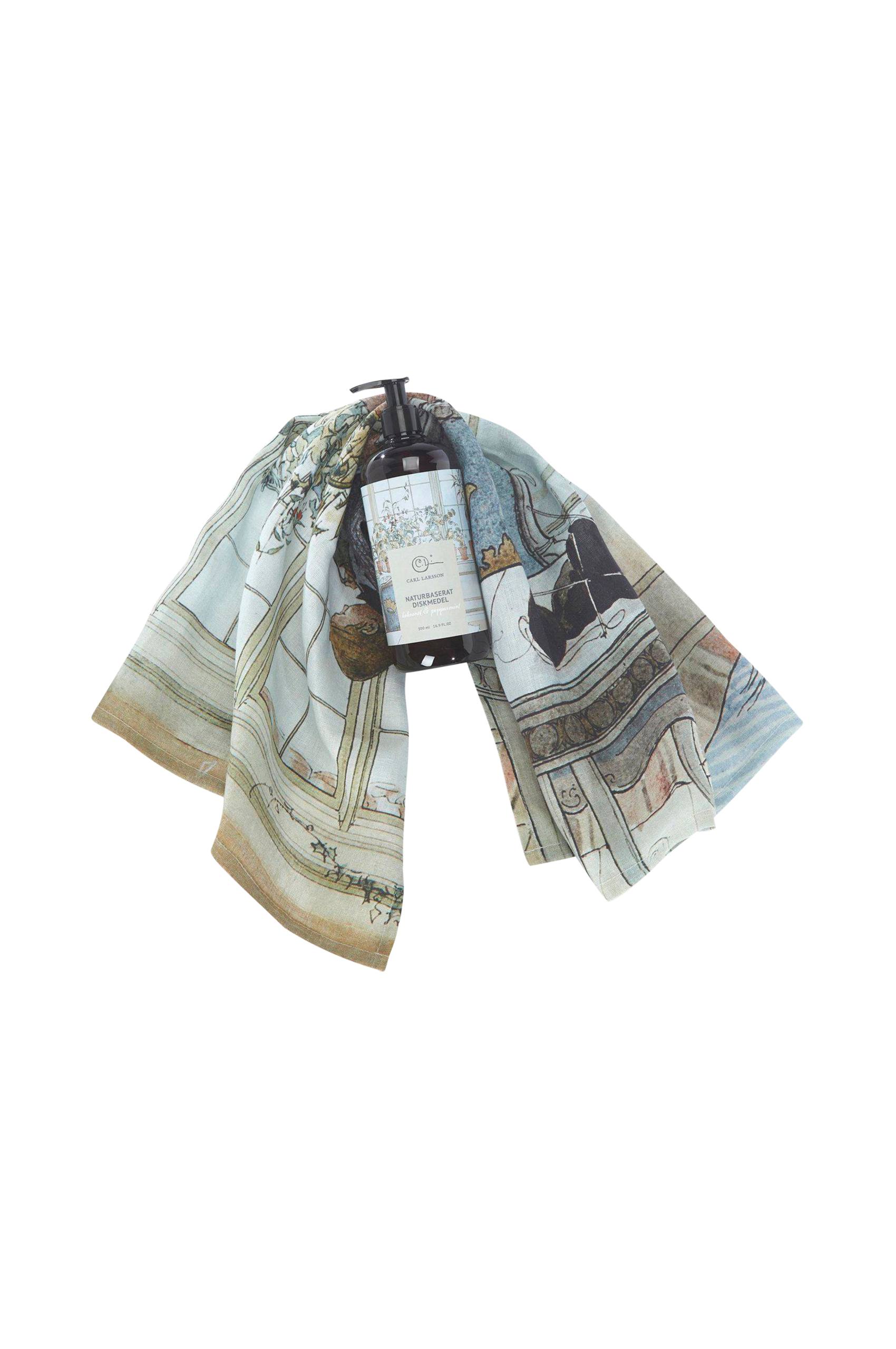 Handdiskmedel och kökshandduk i fint mönster av Carl Larsson i presentförpackning. Kökshandduk i vackert mönster, 100% lin som absorberar bra, 50×70 cm. Handdiskmedel baserat på kokosnötsolja som skonsamt rengör utan att lämna dina händer torra och röda. Innehåller även japansk pepparmint som är antibakteriell och har en ljuvlig fräsch doft. Flaskan innehåller 500ml.