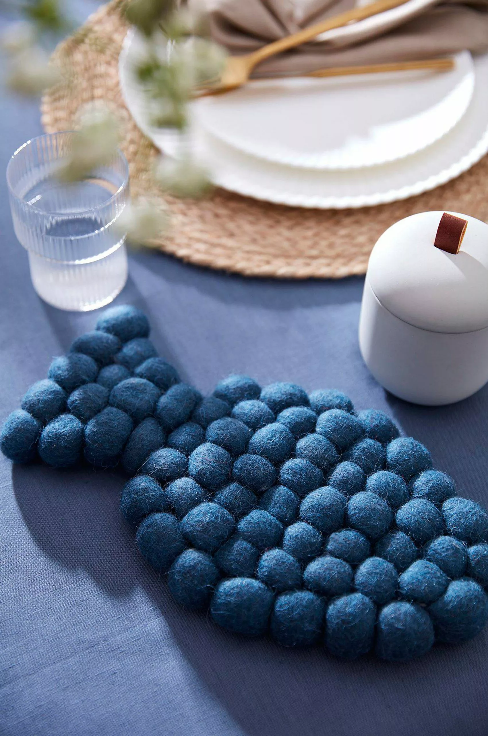 Grytunderlägg i ull med tovade bollar, för att skydda bordet mot varma kärl. Produkten är certifierad enligt STANDARD 100 by OEKO-TEX®. Certifieringen garanterar att produkten är testad och fri ämnen som kan vara skadliga för hälsan och miljön. 100% Ull.