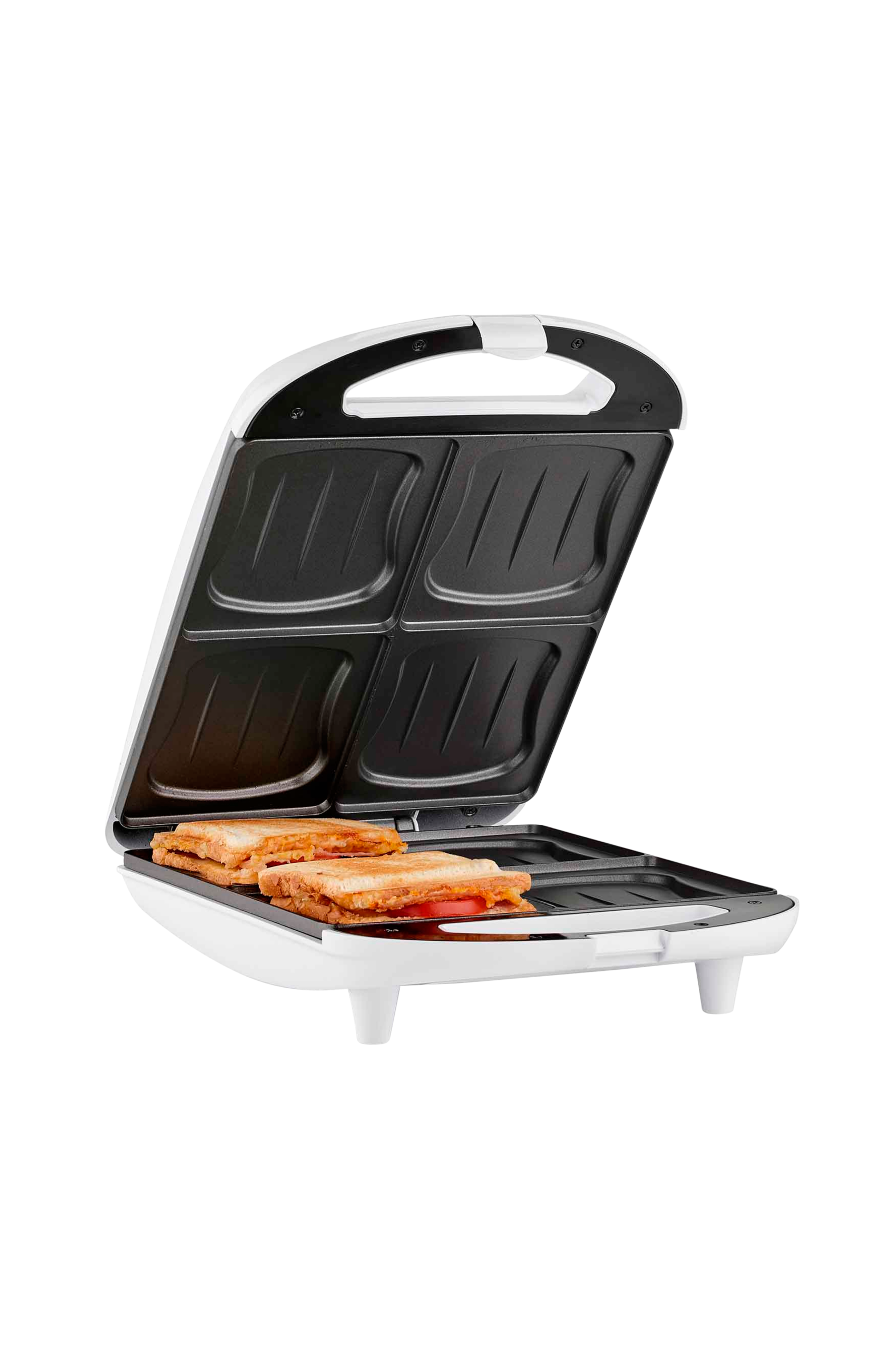 XL Smörgåsjärn för framställning av fyra rostade smörgåsar samtidigt. Med automatisk termostat och indikering när det är klart med snäckformade plattor med nonstickbeläggning för enkel rengöring.
