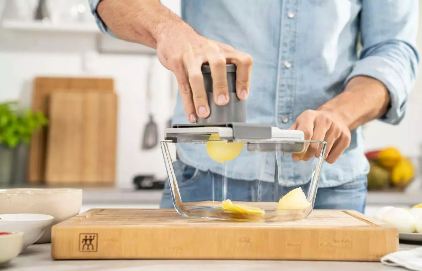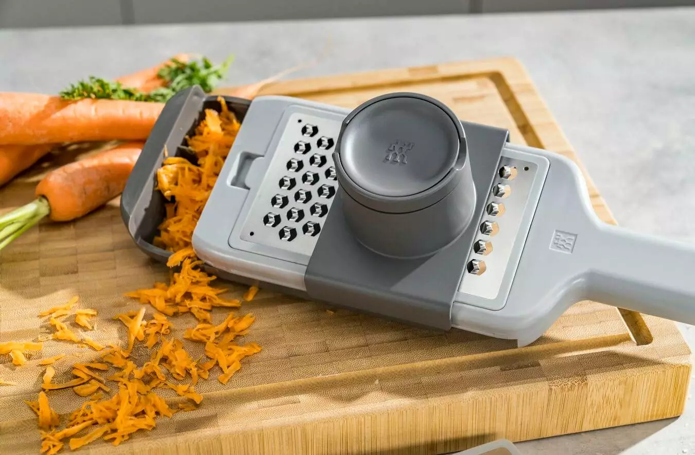 ZWILLING Z-Cut multi-rivjärn är en multiskärare, grönsaksskivare och handrivare i ett. Tack vare sina fyra utbytbara blad (fint rivjärn, medium rivjärn, grovt rivjärn och skivare) kan det användas multifunktionellt och förbereda frukt och grönsaker lika enkelt som hård ost, nötter eller choklad.