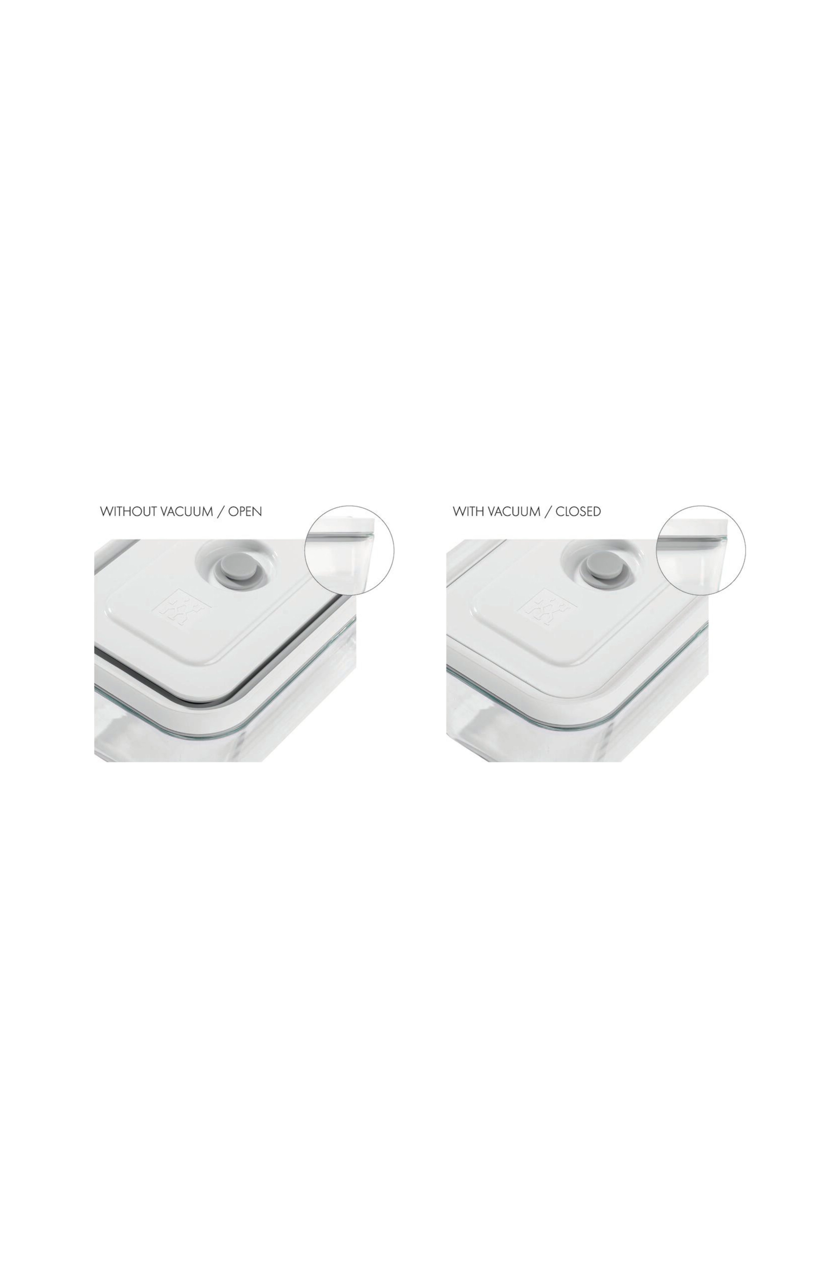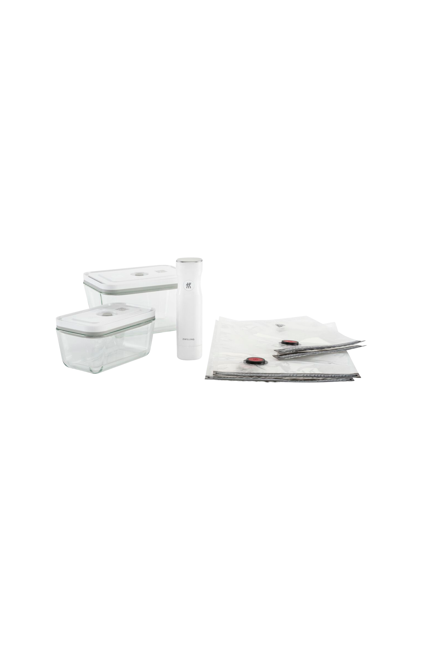 Set med olika vakuumbehållare och påsar för lagring av mat. Startsetet innehåller två vackert designade vakuumbehållare av borosilikatglas, fyra återanvändbara vakuumpåsar och en praktisk, automatisk vakuumpump som gör att maten håller sig färsk upp till fem gånger längre jämfört med lagringsmetoder utan vakuum.
