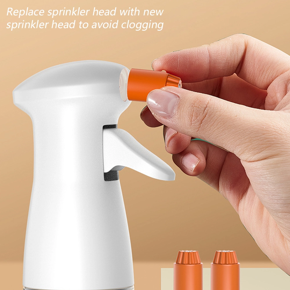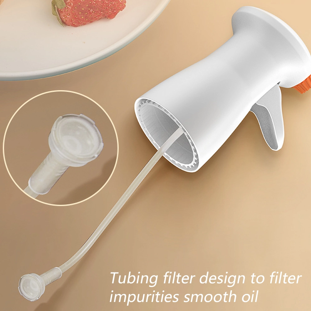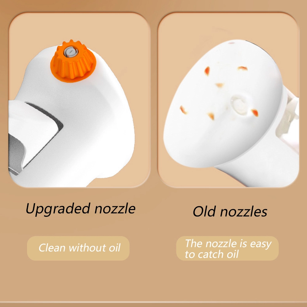 1. [Uppgraderat utbytbart munstycke] – Hälsosamt liv börjar med att kontrollera mängden olja i maten. Munstycket kan rotera. Du kan rotera munstycket för att justera sprutvinkeln och kontrollera trycket för att ändra sprutläget. När munstycket roterar kommer det att ge olika sprayeffekter. Tryck snabbt för att producera en dimeffekt, och tryck ned hälften för att producera en kolumneffekt. (Obs: dimeffekten kommer att påverkas av avståndet och konsistensen hos den fyllda vätskan)
