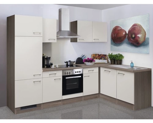 Vinkelköket (280x170xm) består av: inbyggnadsskåp 60cm med 3 dörrar – 1 nisch 88 cm hög – 1 hyllplan – 1 ventilationsgaller, Bänkskåp 50cm med 1 låda – 1 dörr – 1 hyllplan, Inbyggnadsskåp för spis 60cm – 1 fast front – 1 nisch för inbyggnadsspis, Hörnbänkskåp (ställmått 110x60cm) – 1 dörr – 1 låda – 1 hyllplan – 1 hörnpasslist, Diskmaskinspaket (består av: 1 frontpanel för helintegrerad diskmaskin – 1 handtag – 1 sockel 60 cm bred – 1 bänkskiva 110×60 cm), Diskbänksskåp 50 cm – 1 dörr, Överskåp 50cm – 1 hyllplan – 1 dörr – höjd 55cm, Överskåp 60cm – 1 hyllplan – 1 dörr – höjd 55cm, Bänkskiva 220x60cm (den 2:a bänkskivan finns i diskmaskinspaketet, se ovan)