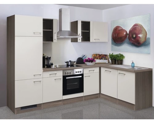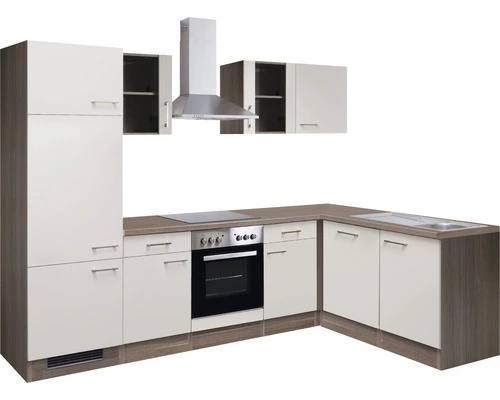Vinkelköket (280x170xm) består av: inbyggnadsskåp 60cm med 3 dörrar – 1 nisch 88 cm hög – 1 hyllplan – 1 ventilationsgaller, Bänkskåp 50cm med 1 låda – 1 dörr – 1 hyllplan, Inbyggnadsskåp för spis 60cm – 1 fast front – 1 nisch för inbyggnadsspis, Hörnbänkskåp (ställmått 110x60cm) – 1 dörr – 1 låda – 1 hyllplan – 1 hörnpasslist, Diskmaskinspaket (består av: 1 frontpanel för helintegrerad diskmaskin – 1 handtag – 1 sockel 60 cm bred – 1 bänkskiva 110×60 cm), Diskbänksskåp 50 cm – 1 dörr, Glasöverskåp 50cm – 1 hyllplan – 1 dörr – höjd 55cm, Överskåp 60cm – 1 hyllplan – 1 dörr – höjd 55cm, Glasöverskåp 50cm – 1 hyllplan – 1 dörr – höjd 55cm, Bänkskiva 220x60cm (den 2:a bänkskivan finns i diskmaskinspaketet, se ovan)