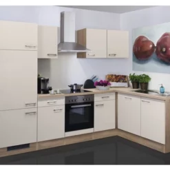 Vinkelköket (280x170xm) består av: inbyggnadsskåp 60cm med 3 dörrar – 1 nisch 88 cm hög – 1 hyllplan – 1 ventilationsgaller, Bänkskåp 50cm med 1 låda – 1 dörr – 1 hyllplan, Inbyggnadsskåp för spis 60cm – 1 fast front – 1 nisch för inbyggnadsspis, Hörnbänkskåp (ställmått 110x60cm) – 1 dörr – 1 låda – 1 hyllplan – 1 hörnpasslist, Diskmaskinspaket (består av: 1 frontpanel för helintegrerad diskmaskin – 1 handtag – 1 sockel 60 cm bred – 1 bänkskiva 110×60 cm), Diskbänksskåp 50 cm – 1 dörr, Överskåp 50cm – 1 hyllplan – 1 dörr – höjd 55cm, Överskåp 60cm – 1 hyllplan – 1 dörr – höjd 55cm, Överskåp 50cm – 1 hyllplan – 1 dörr – höjd 55cm, Bänkskiva 220x60cm (den 2:a bänkskivan finns i diskmaskinspaketet, se ovan)