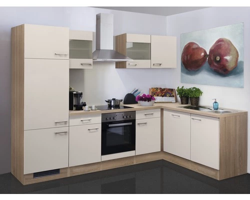 Vinkelköket (280x170xm) består av: inbyggnadsskåp 60cm med 3 dörrar – 1 nisch 88 cm hög – 1 hyllplan – 1 ventilationsgaller, Bänkskåp 50cm med 1 låda – 1 dörr – 1 hyllplan, Inbyggnadsskåp för spis 60cm – 1 fast front – 1 nisch för inbyggnadsspis, Hörnbänkskåp (ställmått 110x60cm) – 1 dörr – 1 låda – 1 hyllplan – 1 hörnpasslist, Diskmaskinspaket (består av: 1 frontpanel för helintegrerad diskmaskin – 1 handtag – 1 sockel 60 cm bred – 1 bänkskiva 110×60 cm), Diskbänksskåp 50 cm – 1 dörr, Glasöverskåp 50cm – 1 hyllplan – 1 dörr – höjd 55cm, Överskåp 60cm – 1 hyllplan – 1 dörr – höjd 55cm, Glasöverskåp 50cm – 1 hyllplan – 1 dörr – höjd 55cm, Bänkskiva 220x60cm (den 2:a bänkskivan finns i diskmaskinspaketet, se ovan)