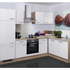 Vinkelköket (280x170xm) består av: inbyggnadsskåp 60cm med 3 dörrar – 1 nisch 88 cm hög – 1 hyllplan – 1 ventilationsgaller, Bänkskåp 50cm med 1 låda – 1 dörr – 1 hyllplan, Inbyggnadsskåp för spis 60cm – 1 fast front – 1 nisch för inbyggnadsspis, Hörnbänkskåp (ställmått 110x60cm) – 1 dörr – 1 låda – 1 hyllplan – 1 hörnpasslist, Diskmaskinspaket (består av: 1 frontpanel för helintegrerad diskmaskin – 1 handtag – 1 sockel 60 cm bred – 1 bänkskiva 110×60 cm), Diskbänksskåp 50 cm – 1 dörr, Överskåp 50cm – 1 hyllplan – 1 dörr – höjd 55cm, Överskåp 60cm – 1 hyllplan – 1 dörr – höjd 55cm, Överskåp 50cm – 1 hyllplan – 1 dörr – höjd 55cm, Bänkskiva 220x60cm (den 2:a bänkskivan finns i diskmaskinspaketet, se ovan)