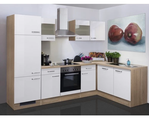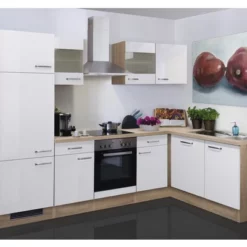 Vinkelköket (280x170xm) består av: inbyggnadsskåp 60cm med 3 dörrar – 1 nisch 88 cm hög – 1 hyllplan – 1 ventilationsgaller, Bänkskåp 50cm med 1 låda – 1 dörr – 1 hyllplan, Inbyggnadsskåp för spis 60cm – 1 fast front – 1 nisch för inbyggnadsspis, Hörnbänkskåp (ställmått 110x60cm) – 1 dörr – 1 låda – 1 hyllplan – 1 hörnpasslist, Diskmaskinspaket (består av: 1 frontpanel för helintegrerad diskmaskin – 1 handtag – 1 sockel 60 cm bred – 1 bänkskiva 110×60 cm), Diskbänksskåp 50 cm – 1 dörr, Glasöverskåp 50cm – 1 hyllplan – 1 dörr – höjd 55cm, Överskåp 60cm – 1 hyllplan – 1 dörr – höjd 55cm, Glasöverskåp 50cm – 1 hyllplan – 1 dörr – höjd 55cm, Bänkskiva 220x60cm (den 2:a bänkskivan finns i diskmaskinspaketet, se ovan)